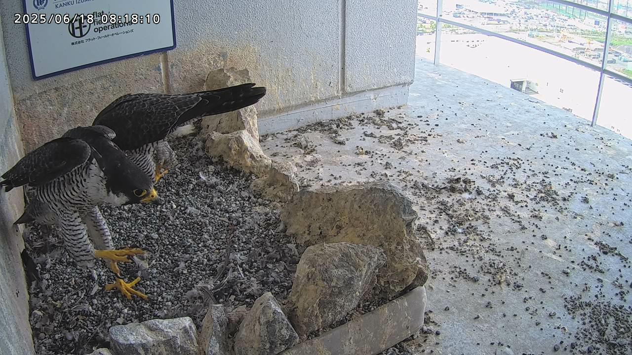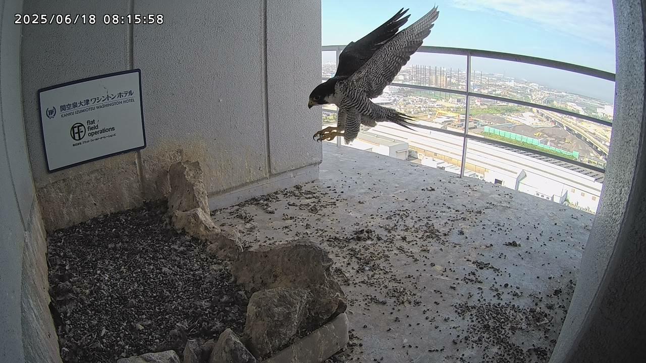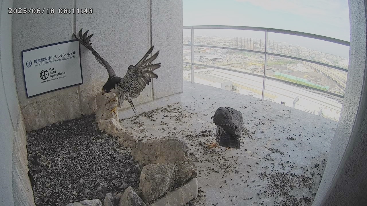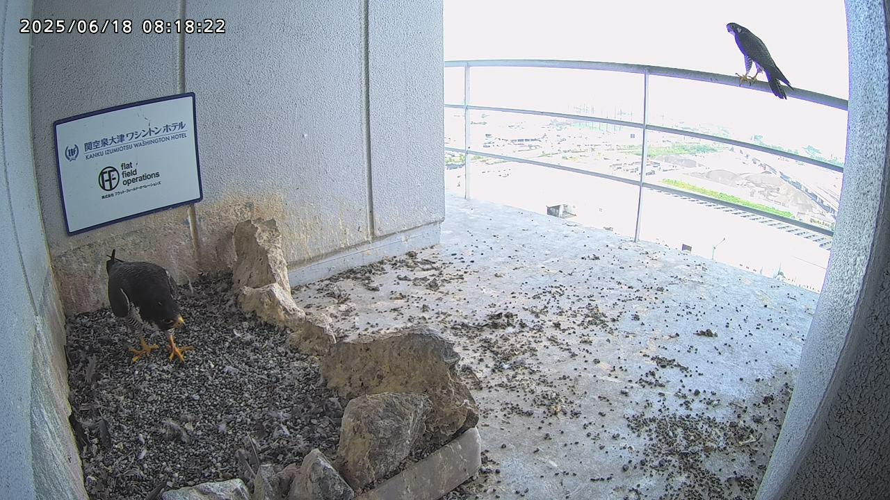 8:11 さらちゃんがベランダにいるところにきららⅣくんが手すりを飛び越して巣に入りました。続いてさらちゃんも巣に入り、巣の中ツーショット。ヒナの巣立ち後2回目でした。その後、きららⅣくんは一旦手すりにとまり、さらちゃんがベランダにに出た隙にまた巣に入りました。さらちゃんも続いて巣に入りまたツーショット。