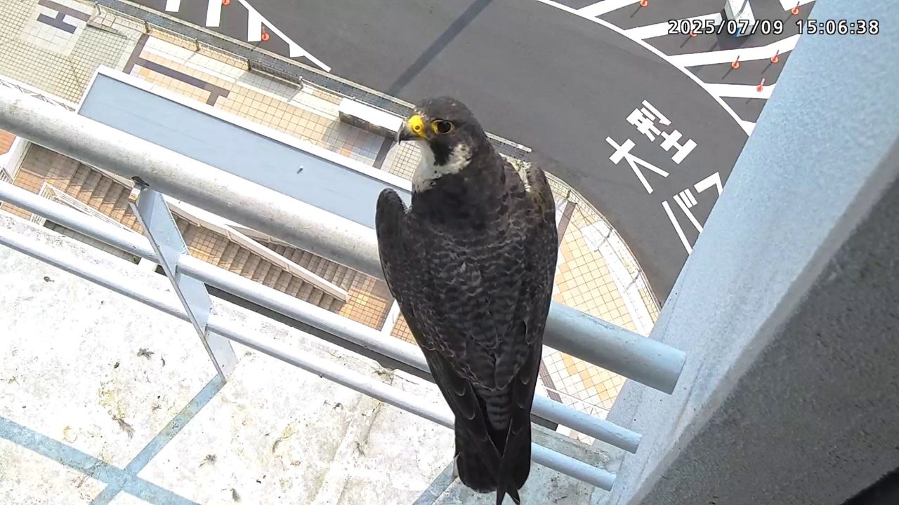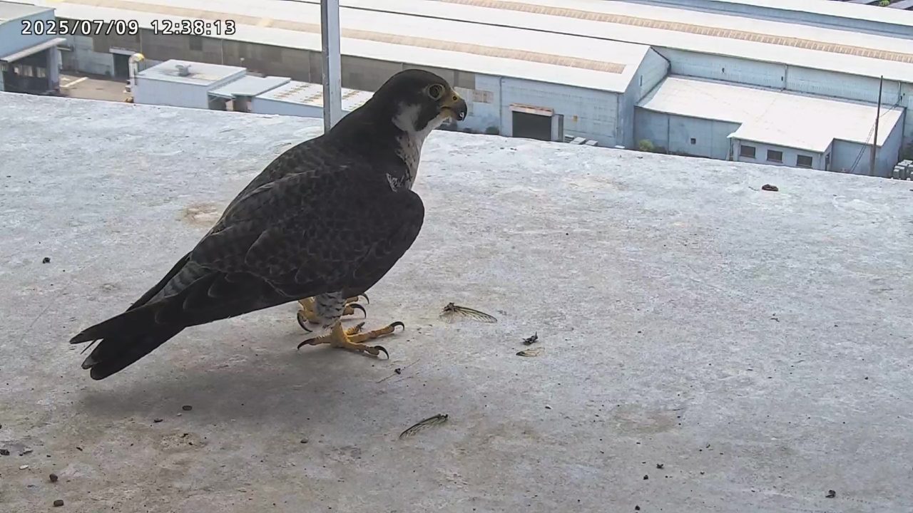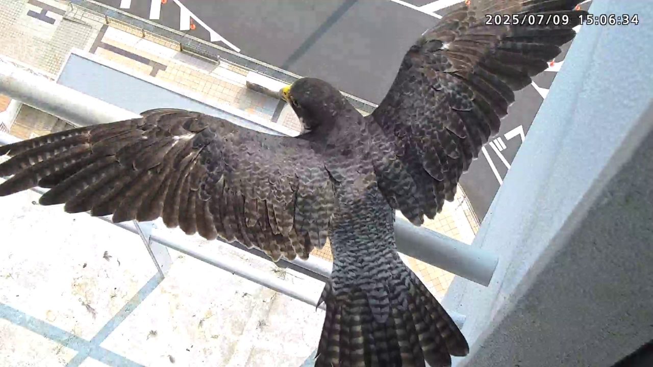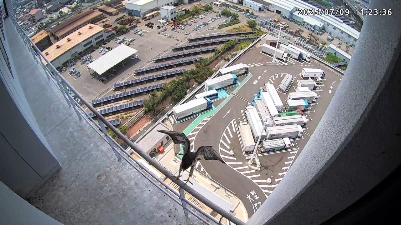 2025年7月9日(水)観察メモ 2025.07.092025.07.11 前:PREV 後:NEXT YouTube動画 はここをクリックしてください 7月9日(水)【120】第1子・第2子(81日齢) 本日の観察概要 04:40 さらちゃんが手すりに来て、04:43に飛びました。11:23 きららⅣくんが来て、ベランダに舞い込んだセミを捉えました。 見守りりカメラ映像による観察 04:40 さらちゃんが手すりに来ましたが、04:43に飛びました 手すりに取り付くさらちゃん さらちゃん 11:23 きららⅣくんが来て、ベランダに舞い込んだセミを捉えました。 手すりに取り付くきららⅣくん セミを捕まえたきららⅣくん 拡大するときららⅣくんの嘴にセミの羽根が見えます ちぎれたセミの羽根が床に落ちています 巣に入りました 奥岩に止まったきららⅣくん 手すりに留まったきららⅣくん きららⅣくんの飛び出し 前:PREV 後:NEXT