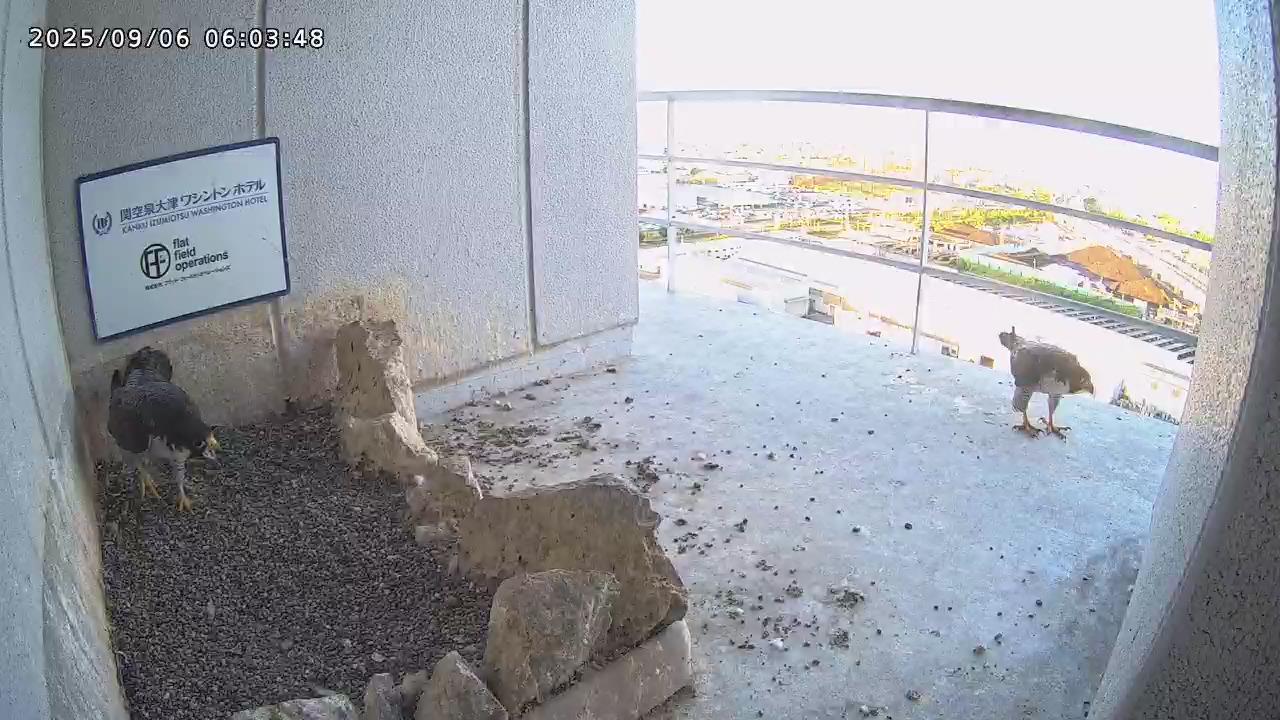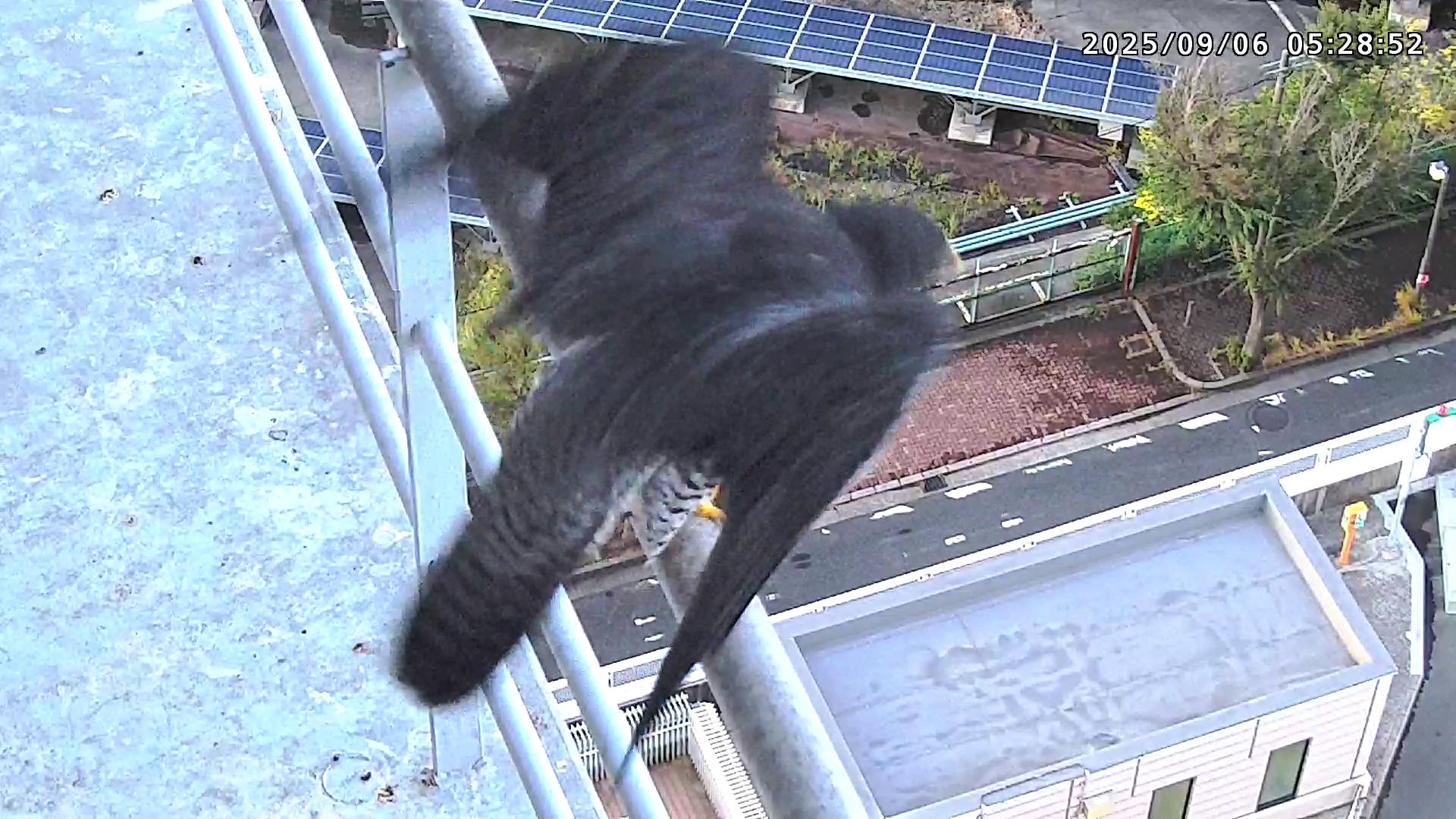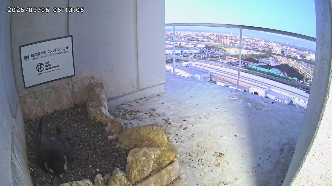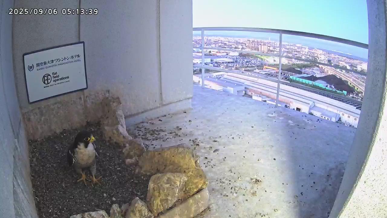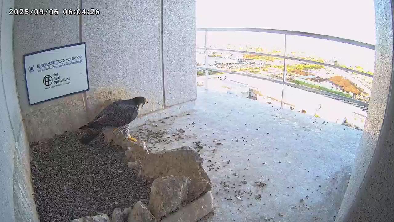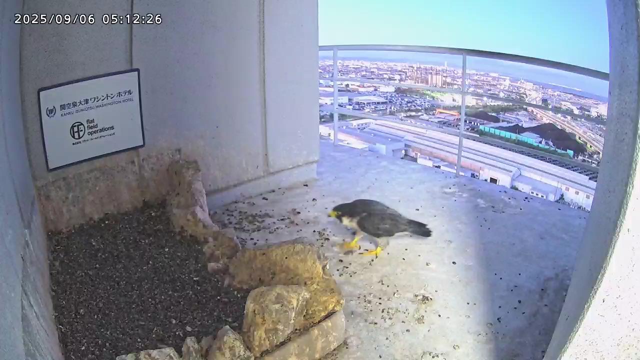 05:09 きららⅣくんがキーキー鳴きながら手すり来て、05:12に巣に入りました。05:15に岩から手すりに移動し、05:28に飛びました。(動画もあります)
