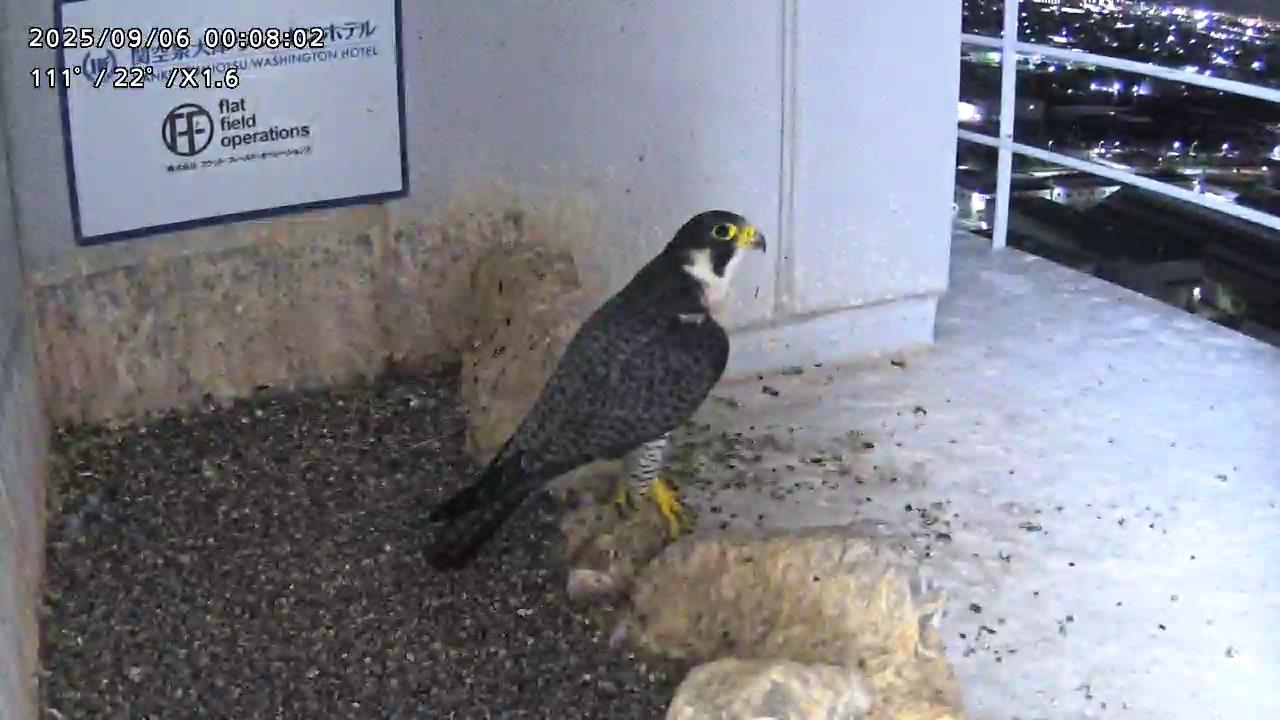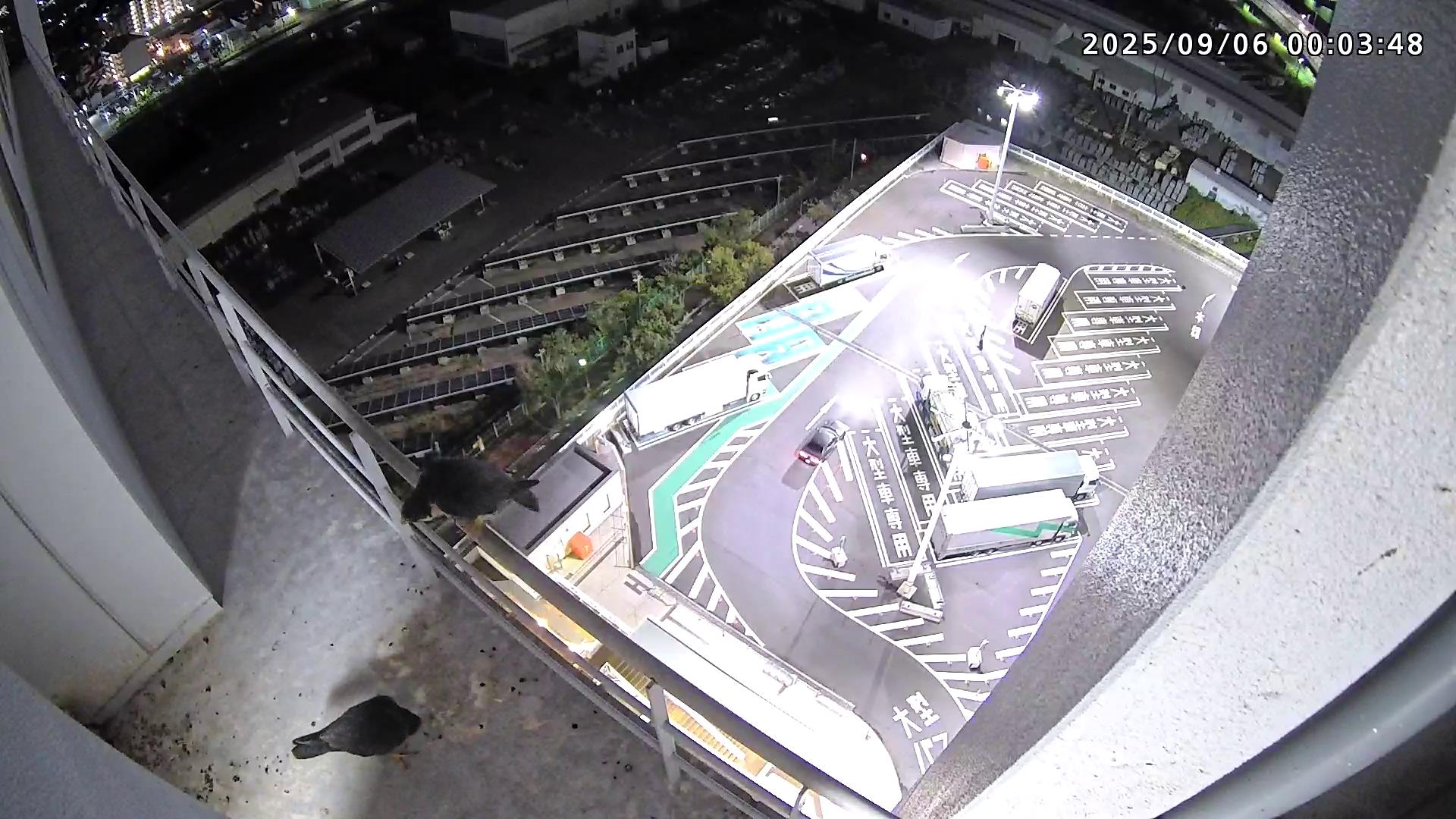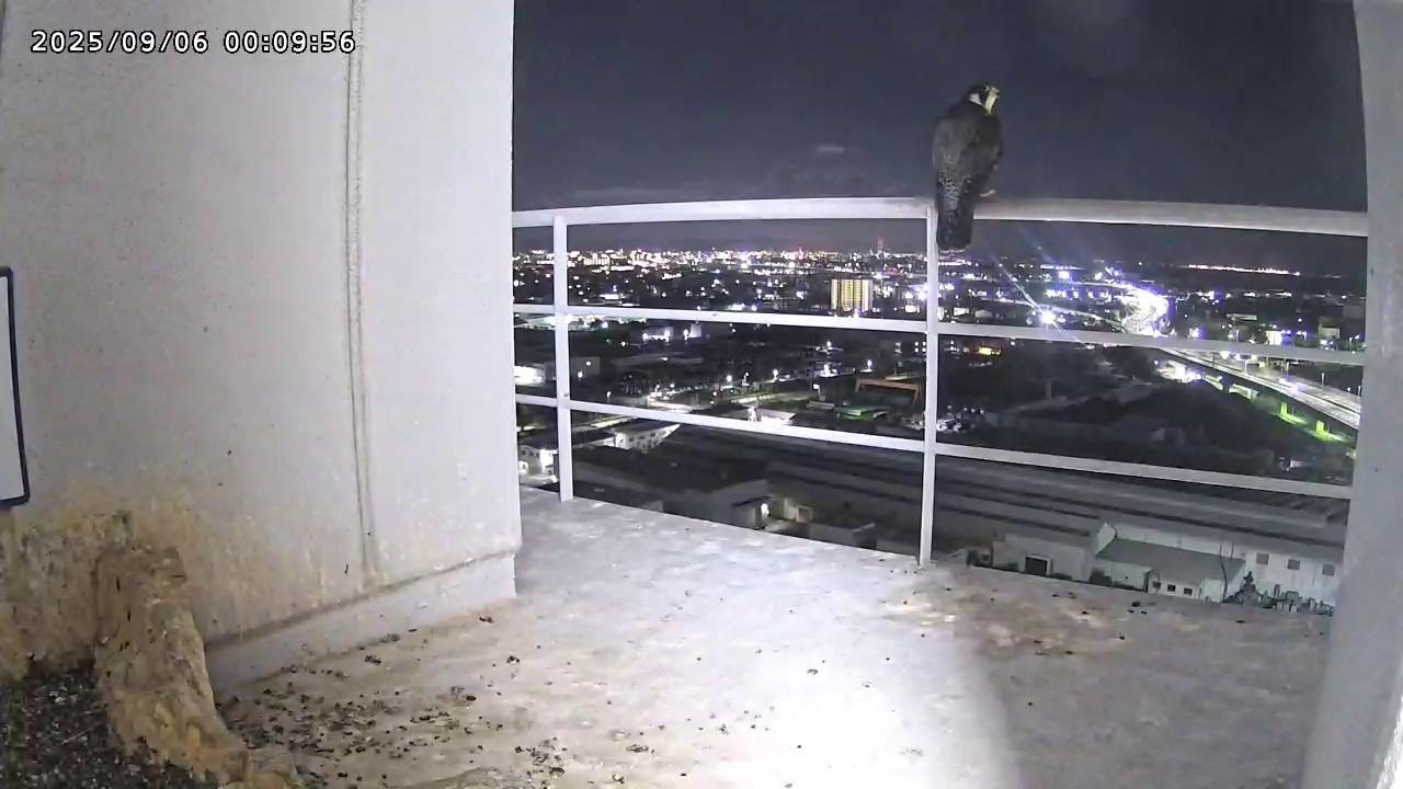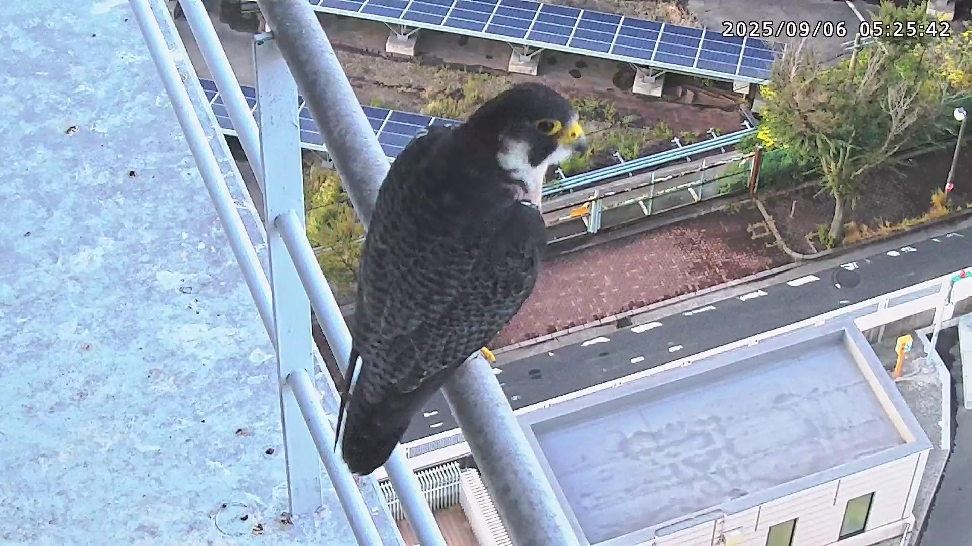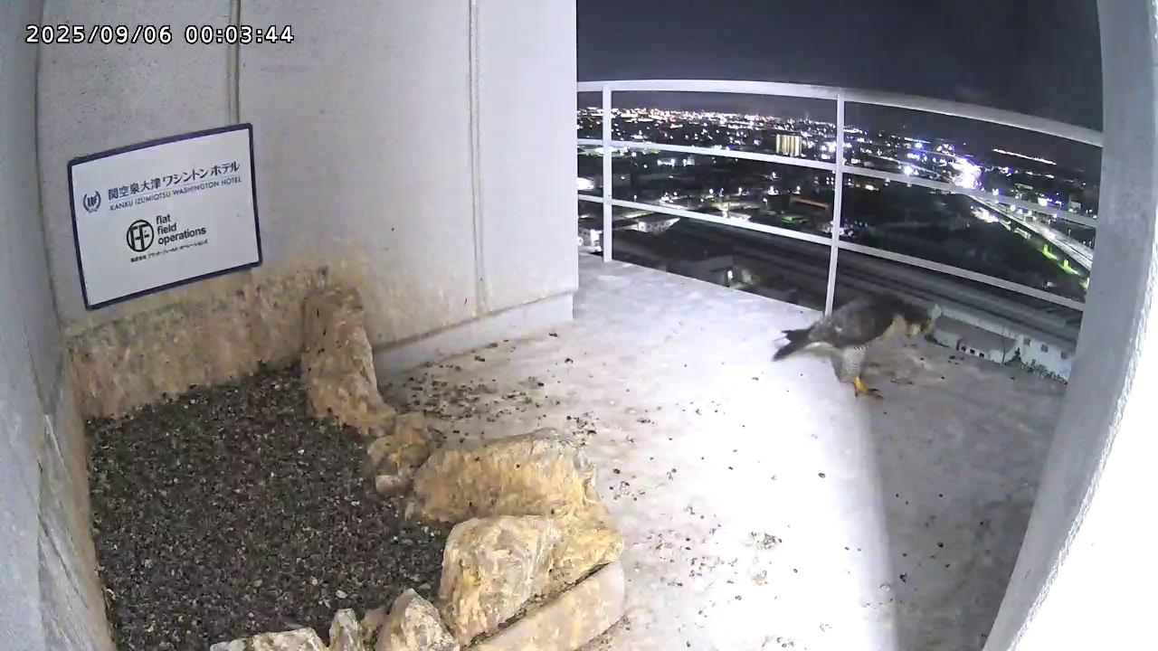 05:09 きららⅣくんがキーキー鳴きながら手すり来て、05:12に巣に入りました。05:15に岩から手すりに移動し、05:28に飛びました。(動画もあります)