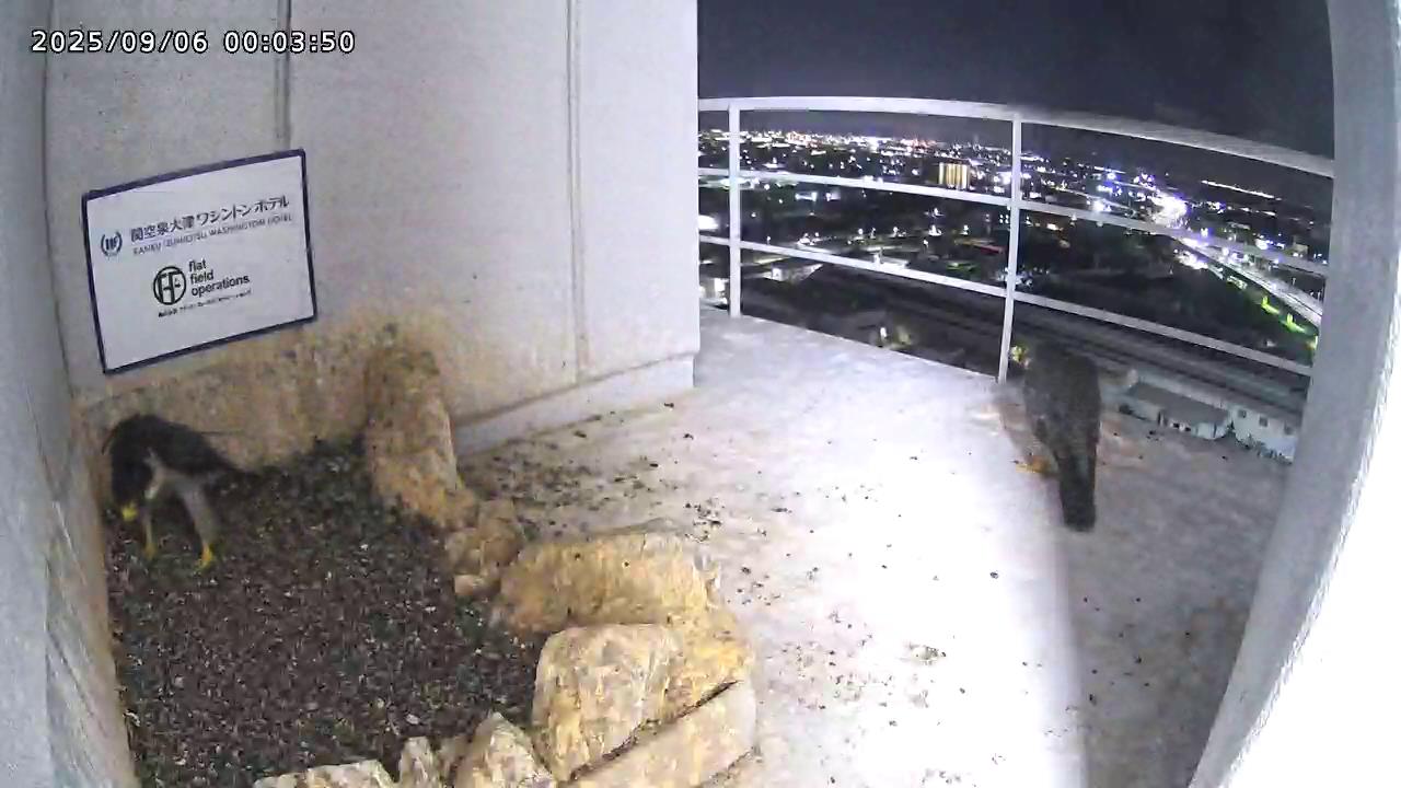 前日から 手すりに居たさらちゃんが00:03にベランダに降りたところに、00:03きららⅣくんが手すりから巣に入りました。さらちゃんは00:04に飛びました。その後きららⅣくんは巣の中で凹み作りなどをして、岩に移り、00:10に飛びました。(動画もあります)