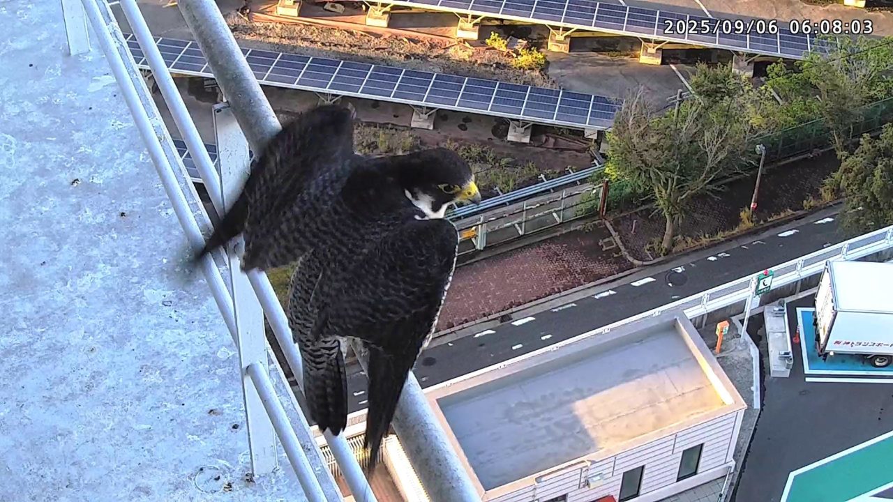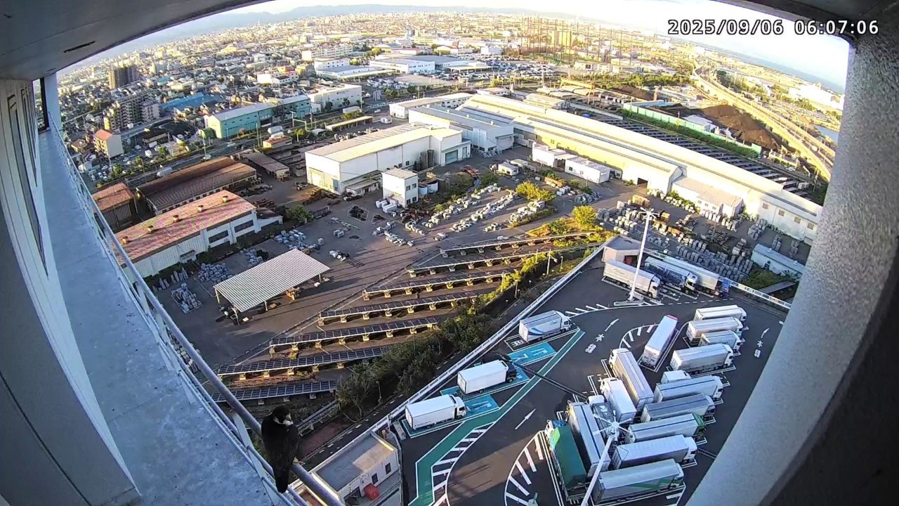 06:03 2羽同時に巣階に来ました。きららⅣくんは手すりから巣に入りましたが、さらちゃんはベランダに残り、06:04に飛びました。きららⅣくんは06:04に手すりに移り、06:08に飛びました。(動画もあります)