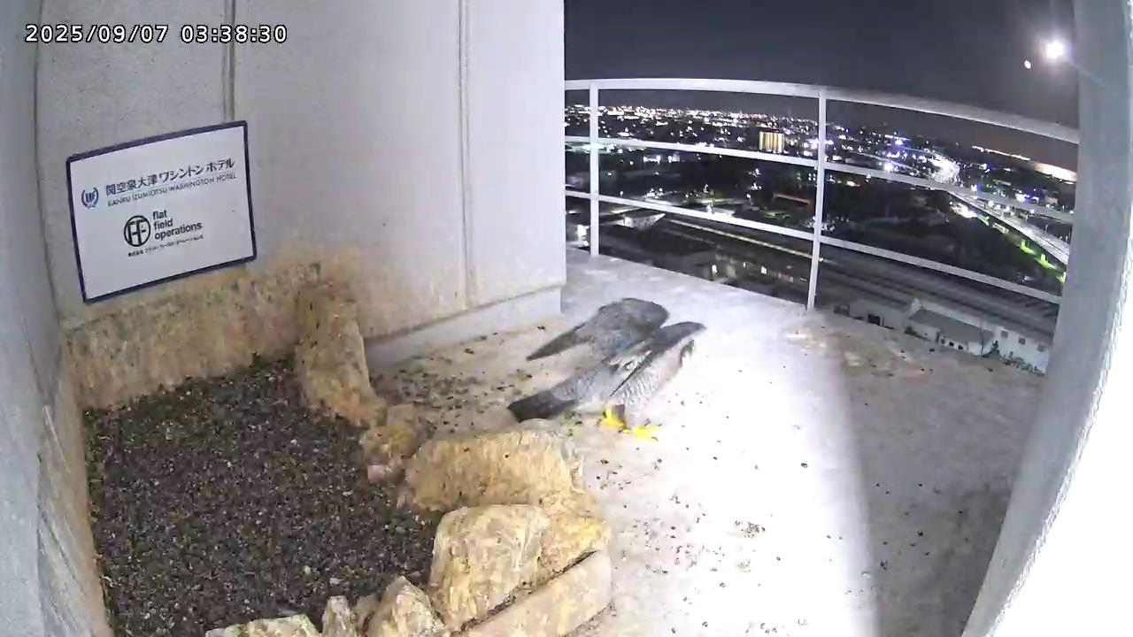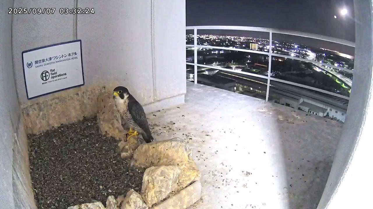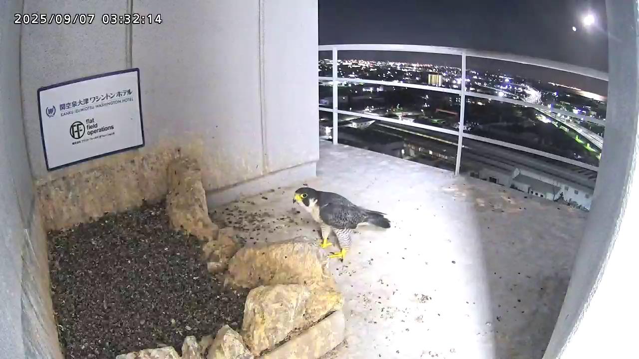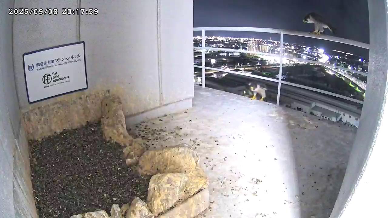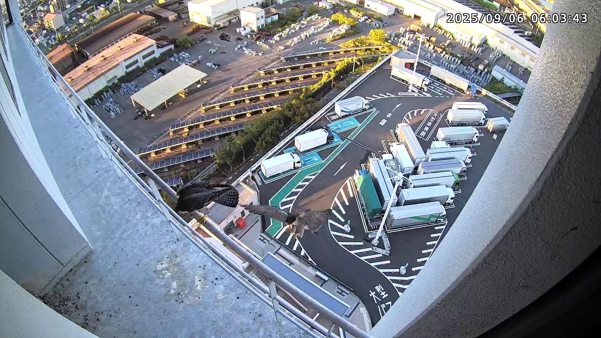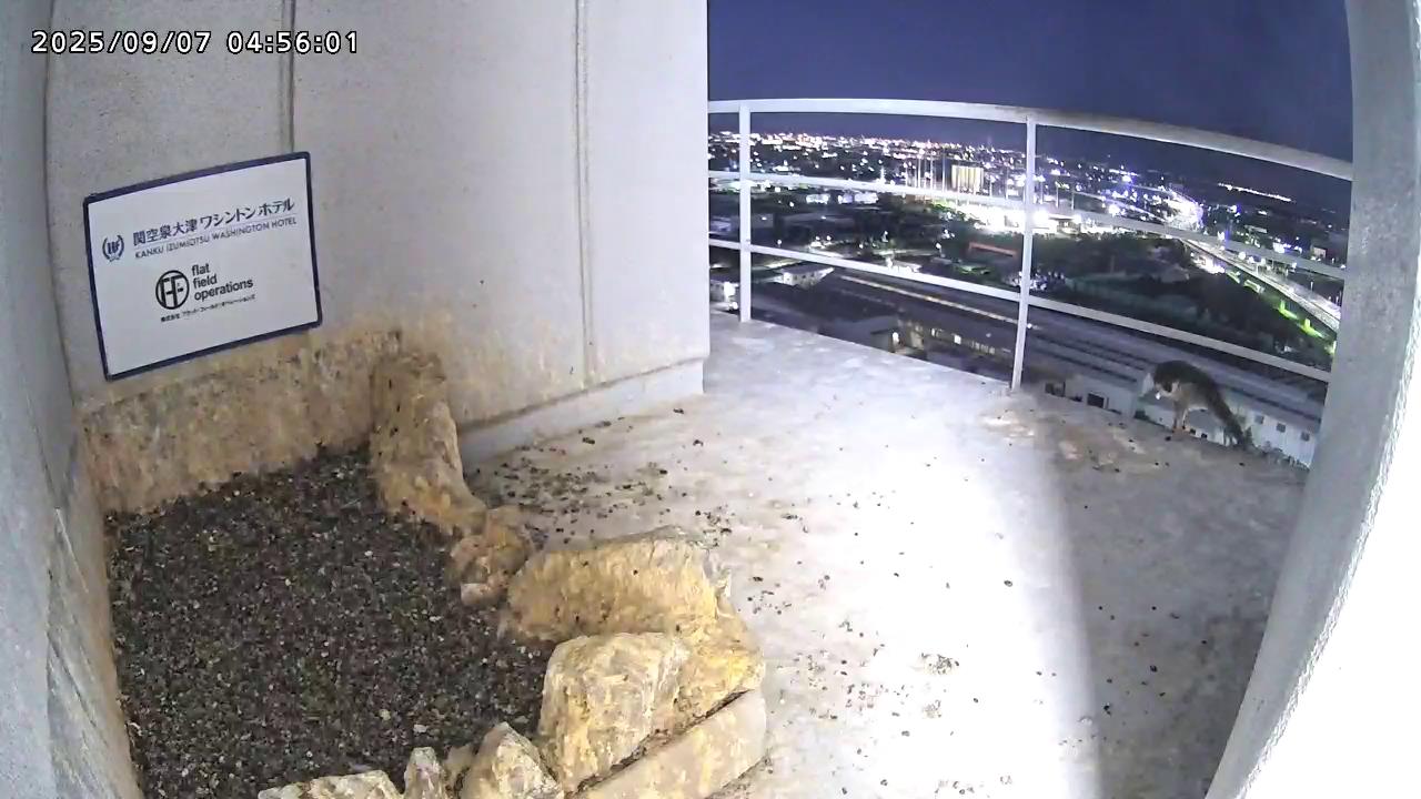 03:22 きららⅣくんが手すりから巣に入りました。03:38にベランダに出て、ベランダの縁で伸びをしたりして長居していましたが、04:58に飛びました。(動画もあります)