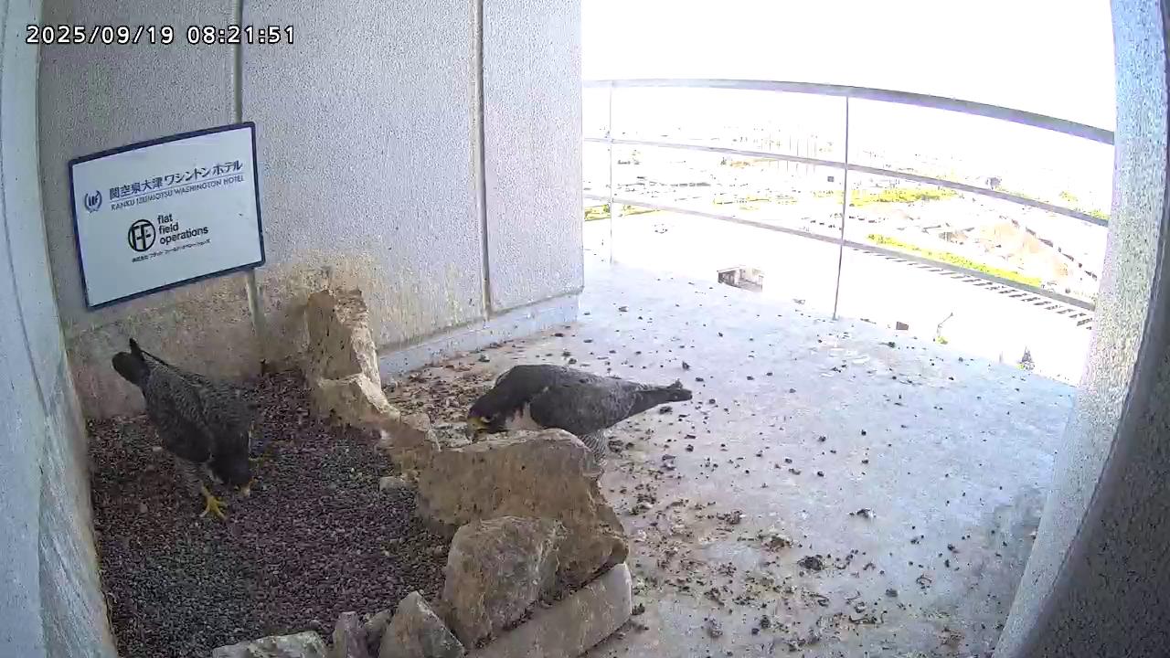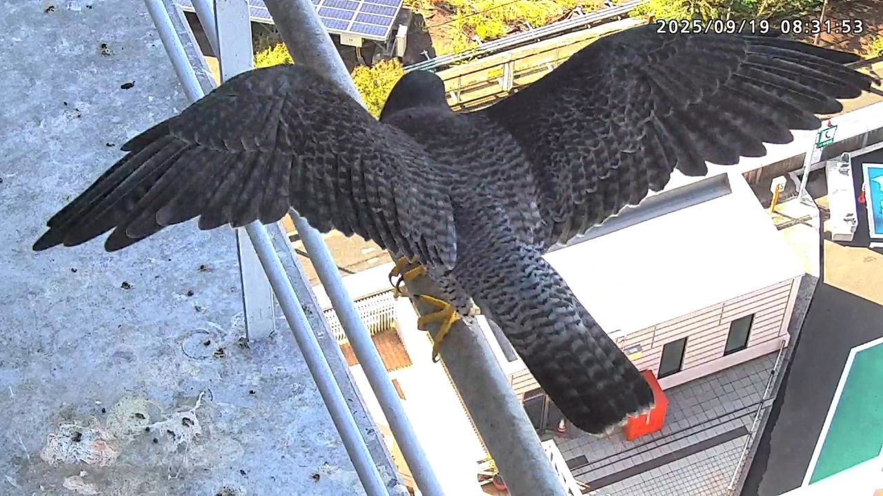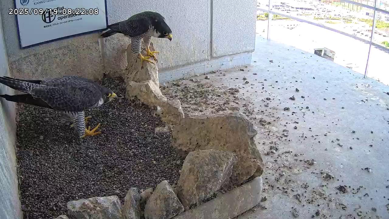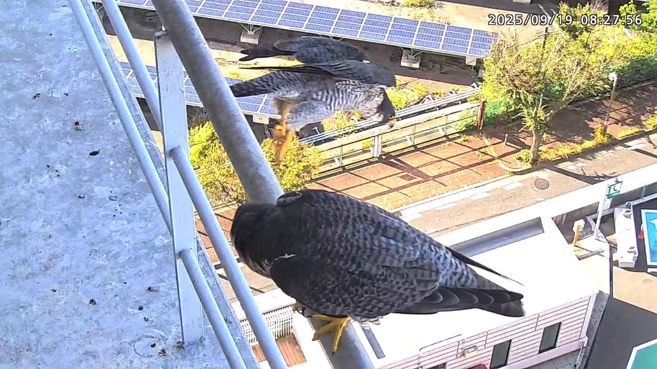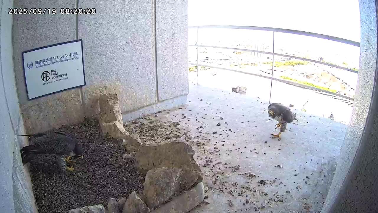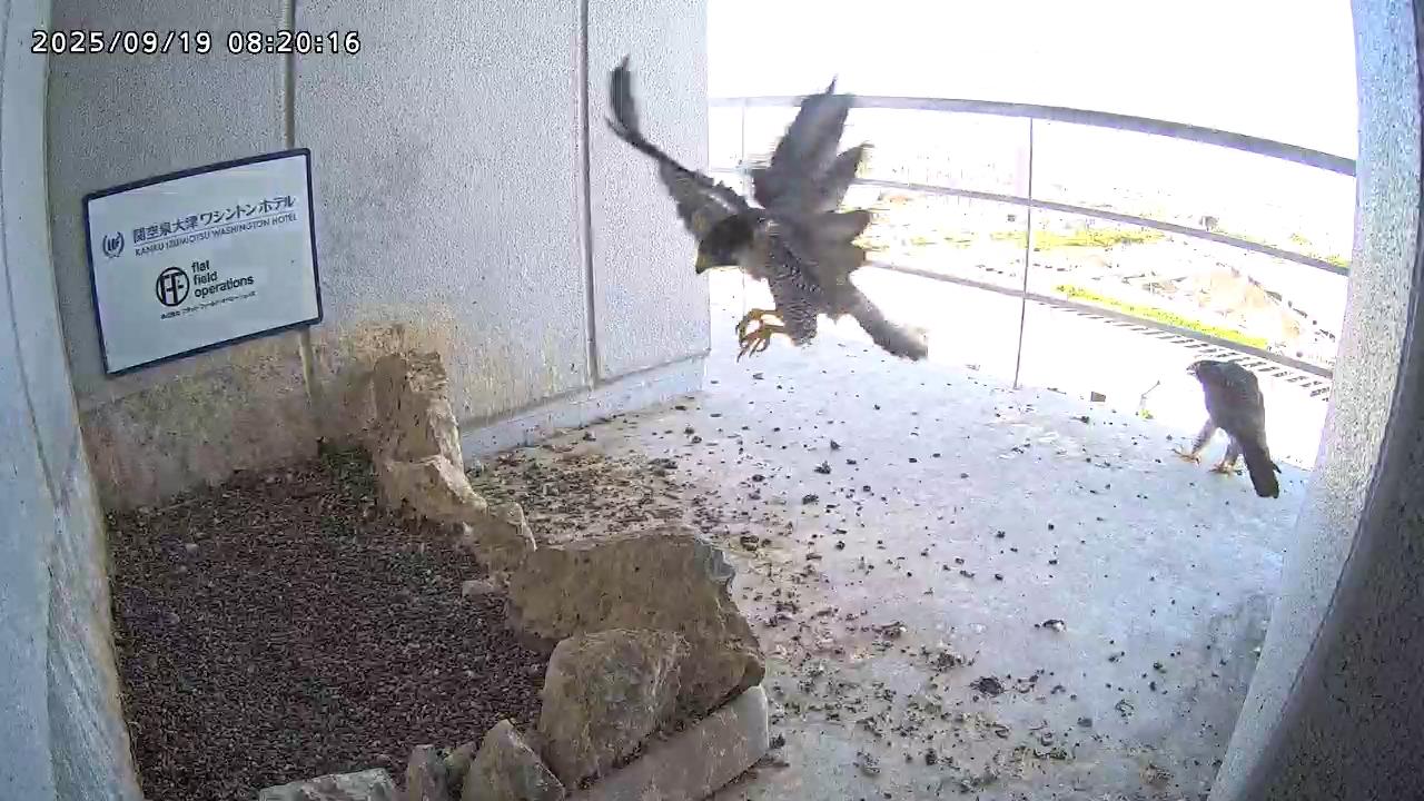08:20 2羽揃って巣階に来ました。先にきららⅣくんが巣に飛び込み、さらちゃんも続いて巣に入り巣の中ツーショット。きららⅣくんが巣から出て手すりに居る時、08:27にさらちゃんがその下を潜り抜けて飛び出しました。きららⅣくんは08:31に手すりから飛びました。(動画もあります)