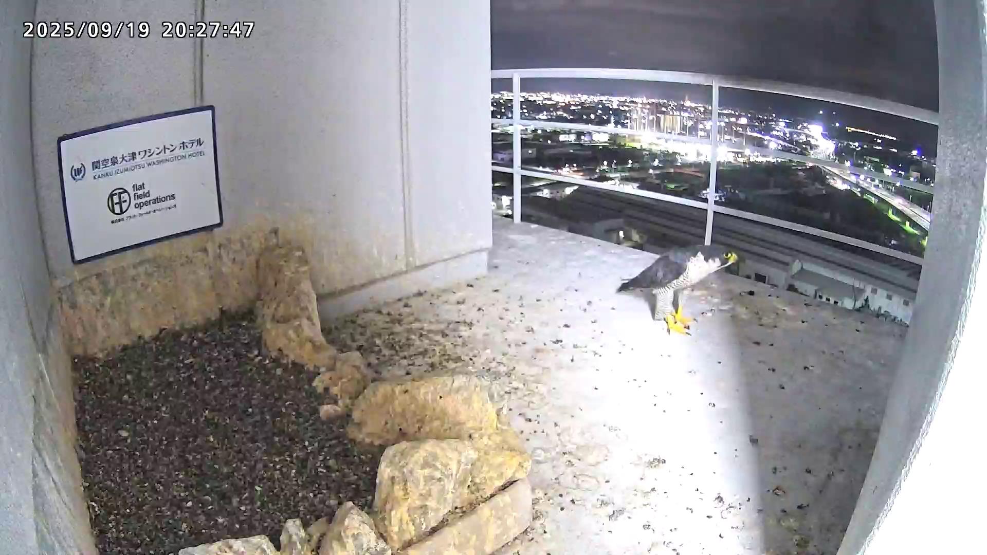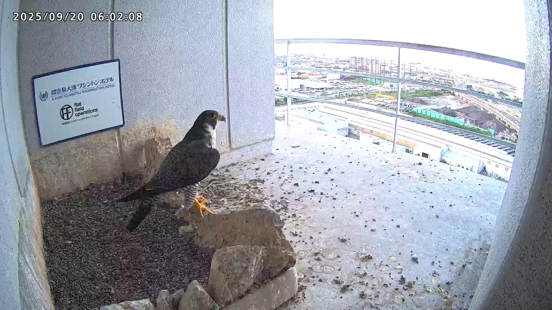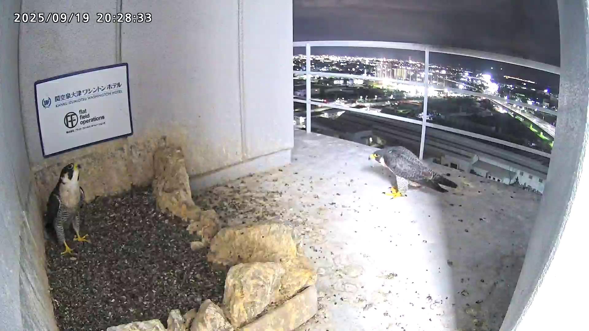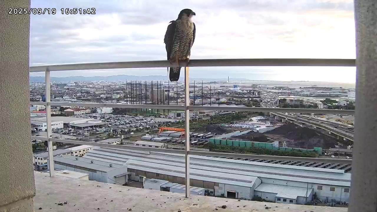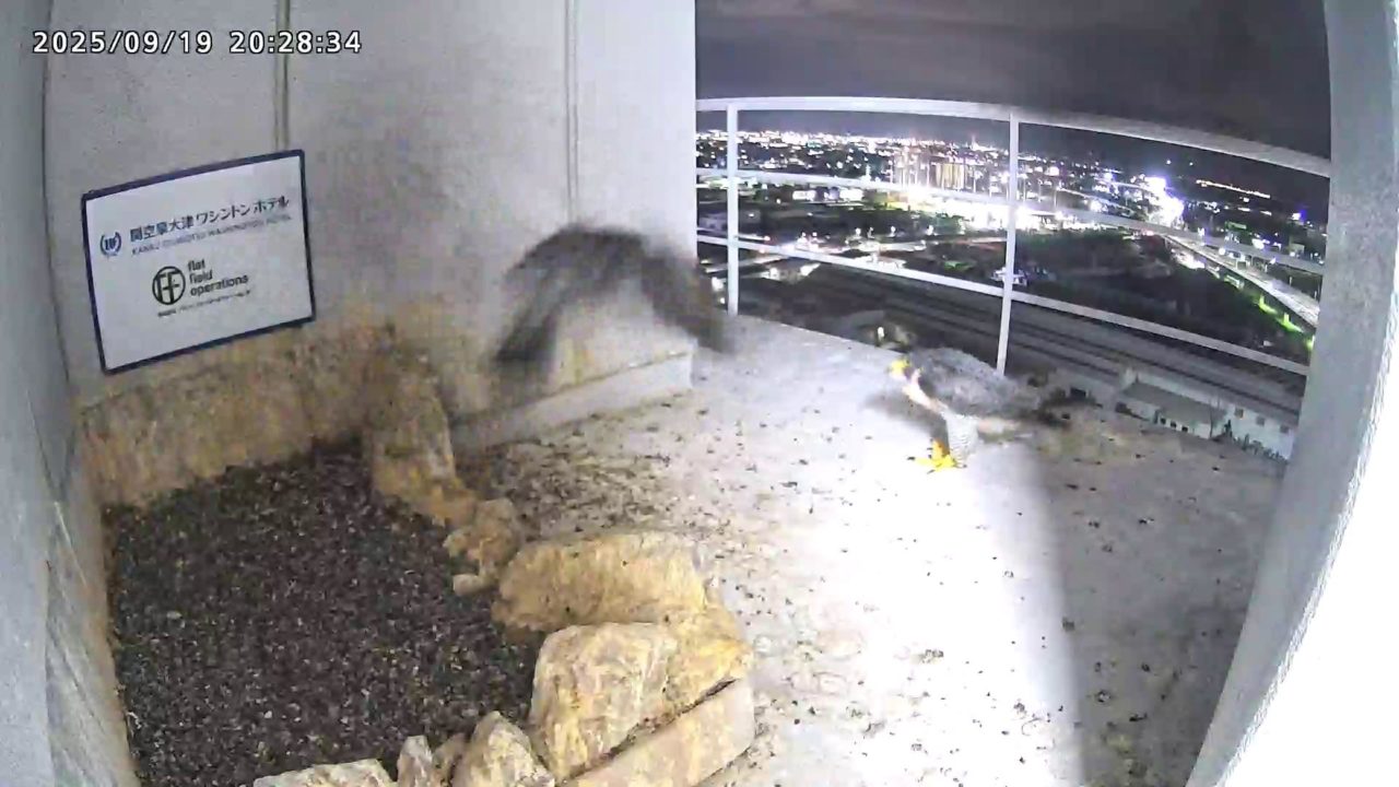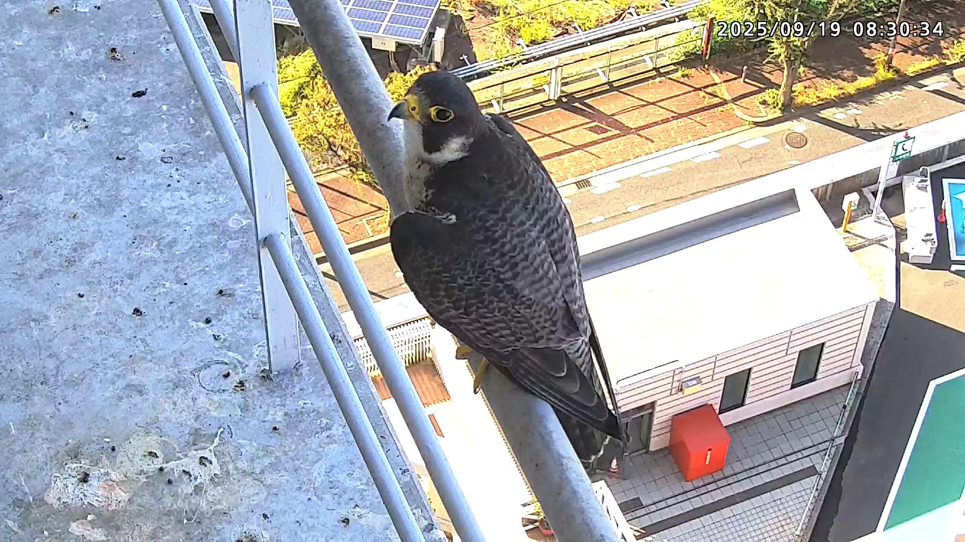 08:20 2羽揃って巣階に来ました。先にきららⅣくんが巣に飛び込み、さらちゃんも続いて巣に入り巣の中ツーショット。きららⅣくんが巣から出て手すりに居る時、08:27にさらちゃんがその下を潜り抜けて飛び出しました。きららⅣくんは08:31に手すりから飛びました。(動画もあります)