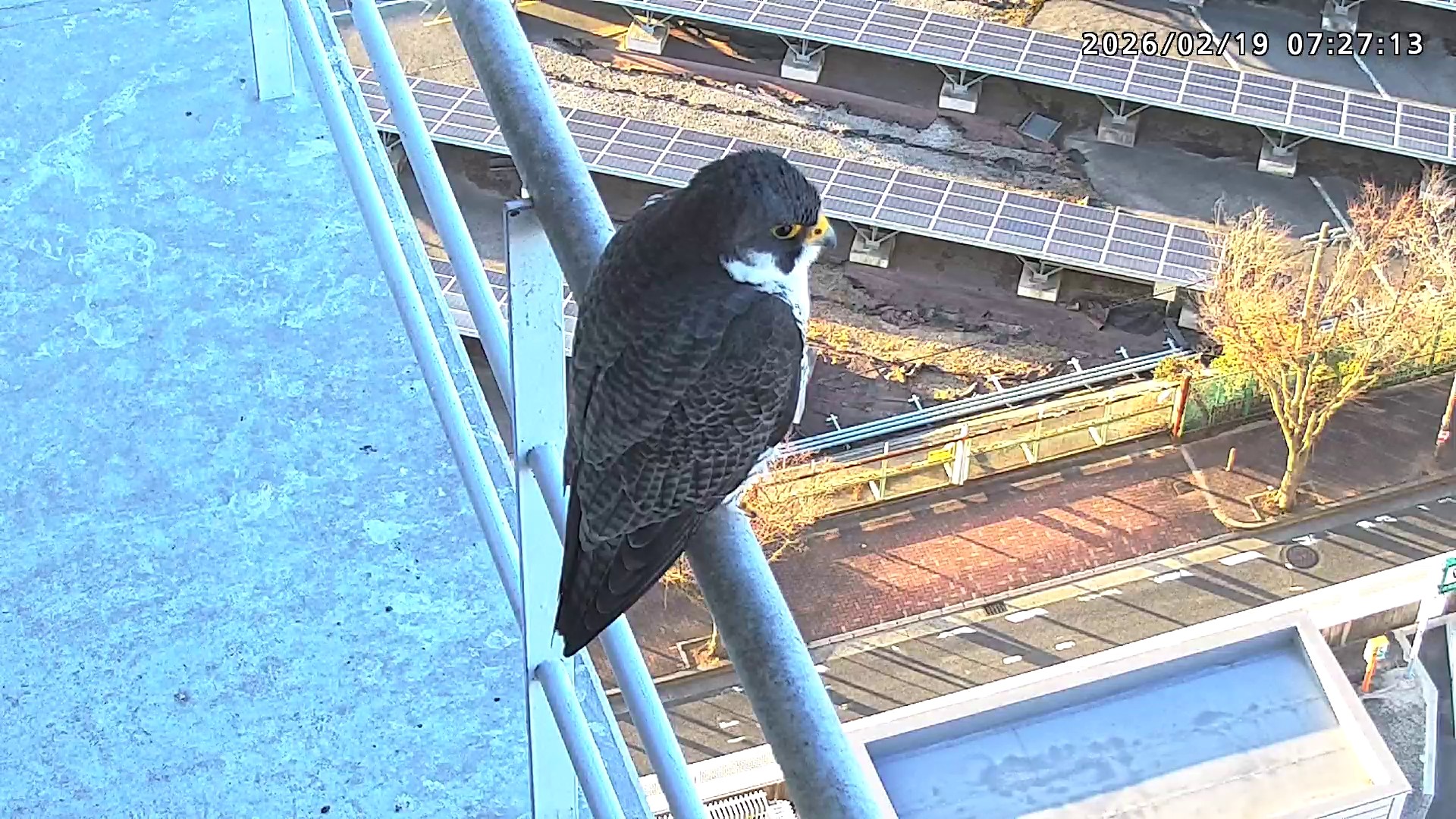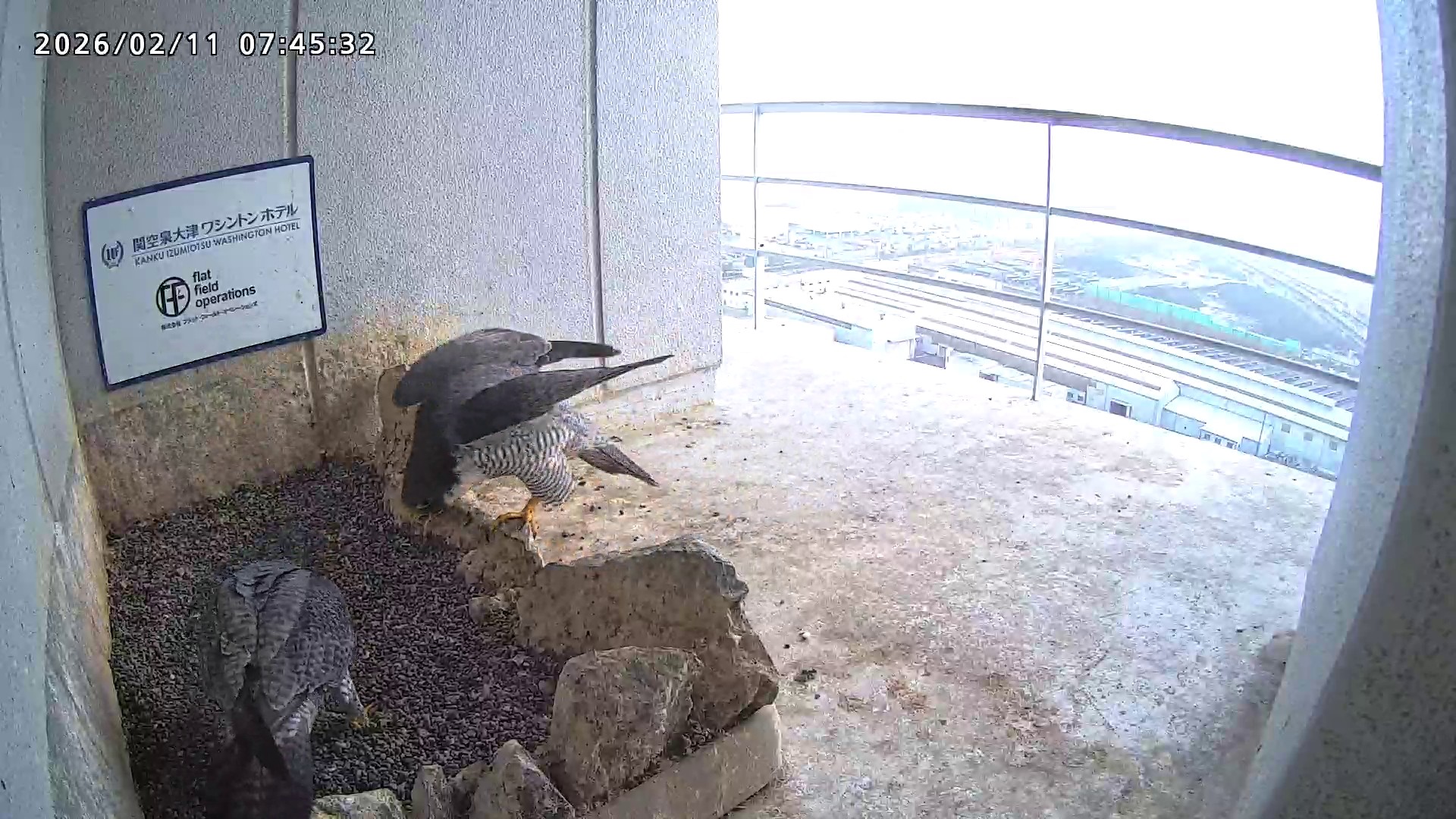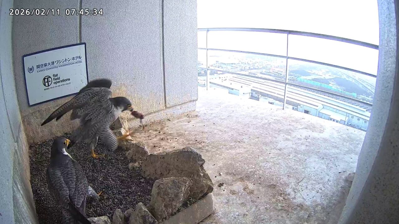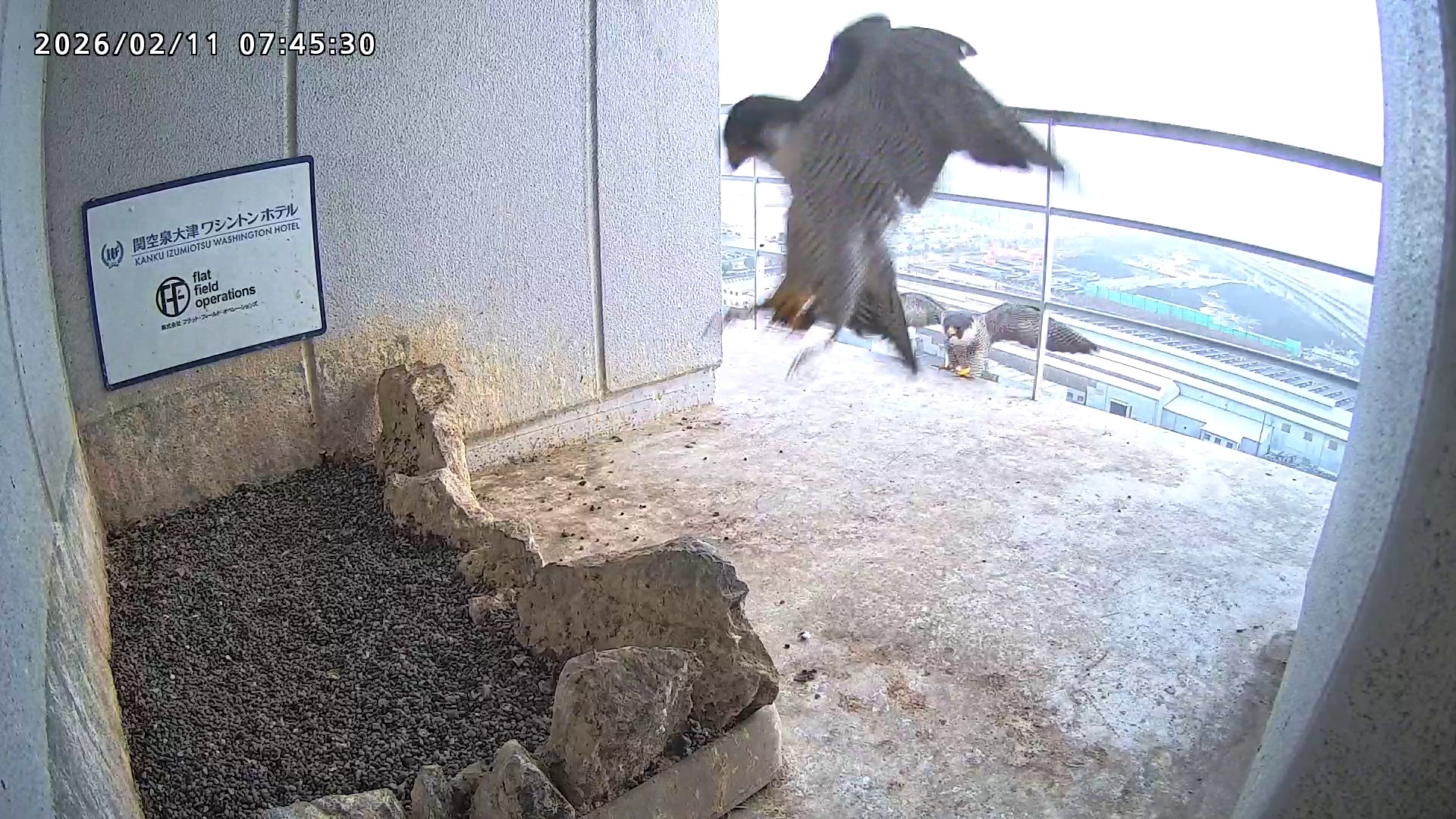07:45 2羽揃って巣階にきて巣に入り、巣の中できららⅣくんからさらちゃんへごはんプレゼントがありました。07:46にはきららⅣくんも手すりから飛びました。(動画あり)
