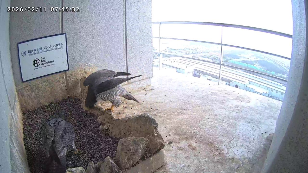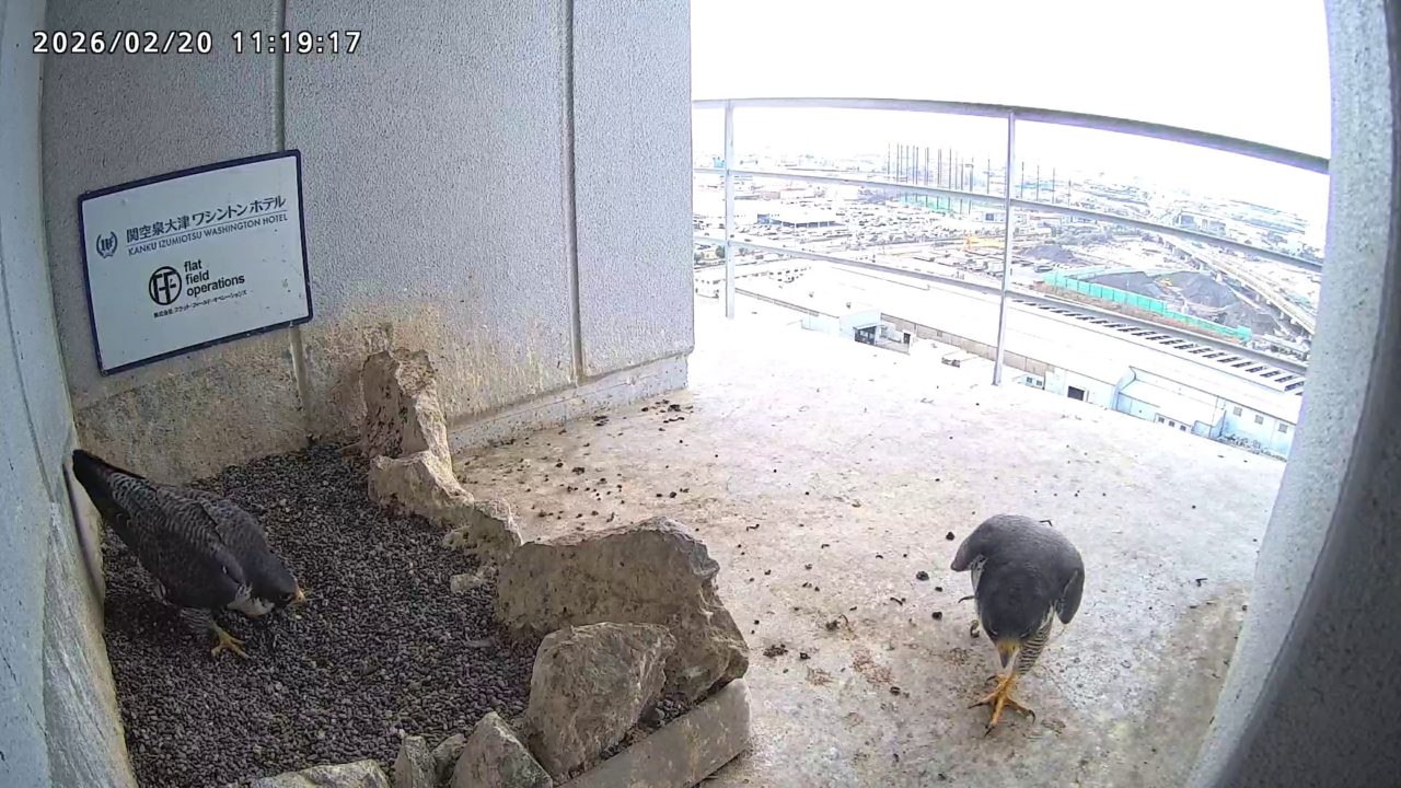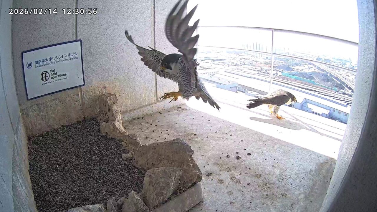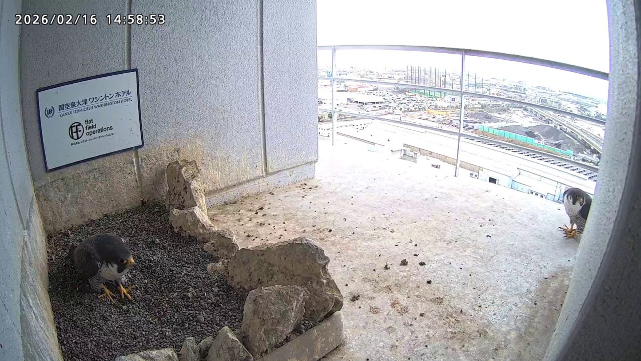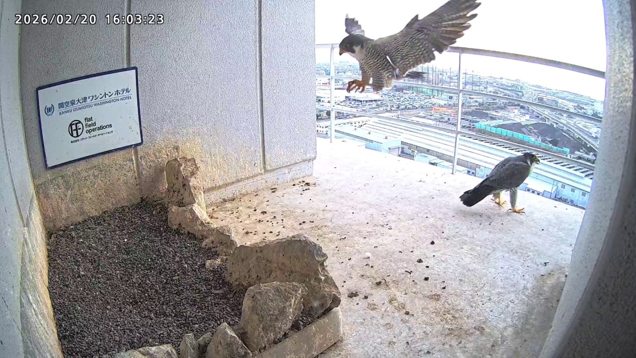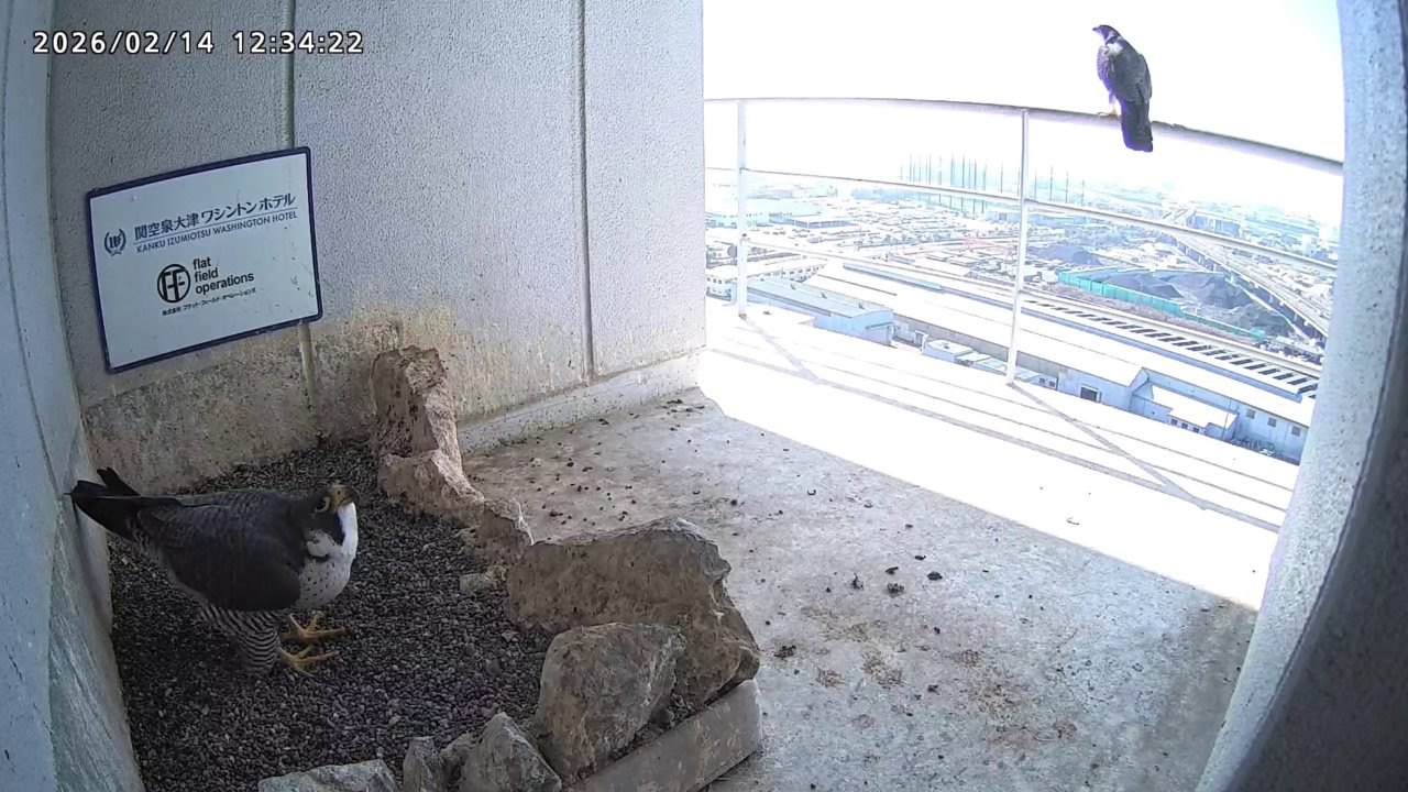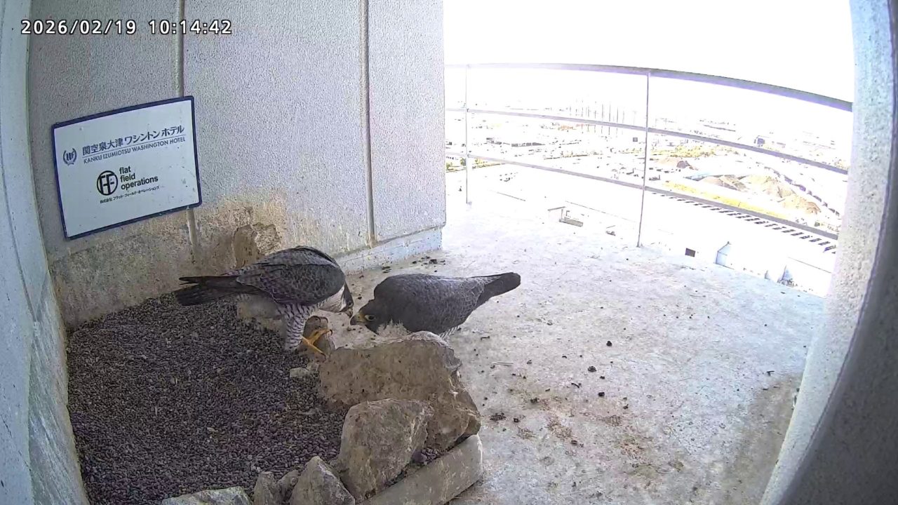 10:08 2羽で巣階にきてきららⅣくんが巣に入りました。さらちゃんは暫くベランダでぐずぐずしていましたが、きららⅣくんが巣から岩に乗るとそばに寄って来て、岩の上下でくちばし合わせをして挨拶しました。きららⅣくんが巣から出て手すりに移動、さらちゃんが巣に入りました。10:21さらちゃんが、10:24にきららⅣくんが飛びました。(動画あり) (動画あり:Full Ver.)