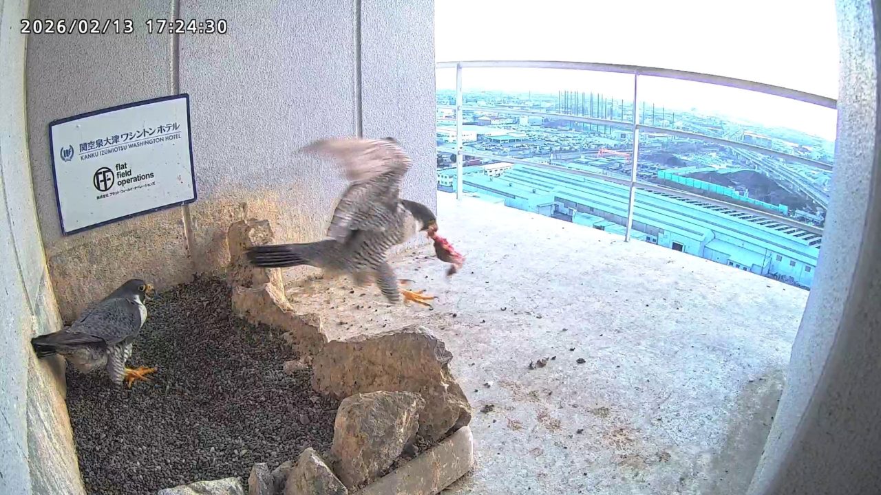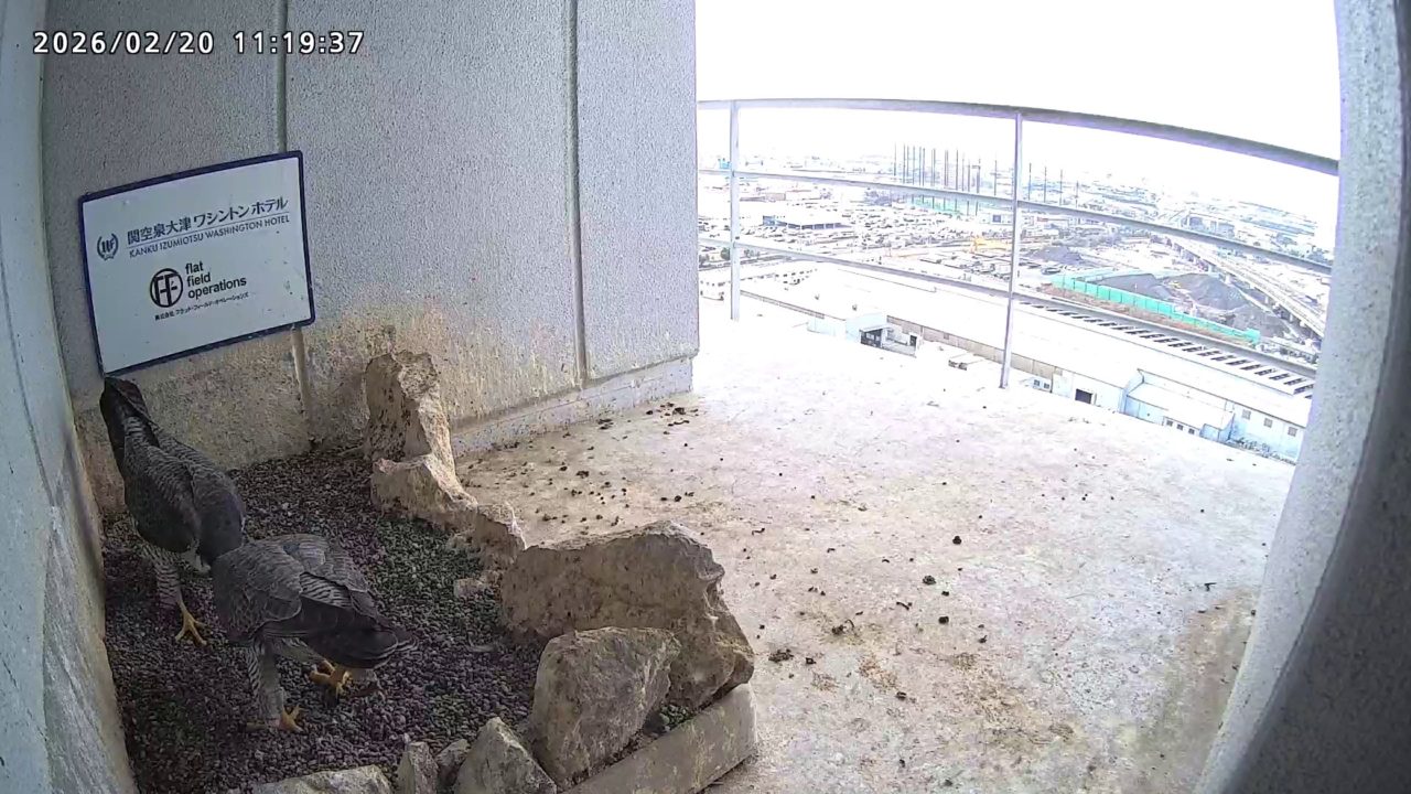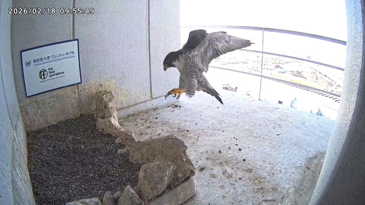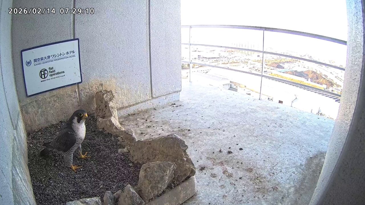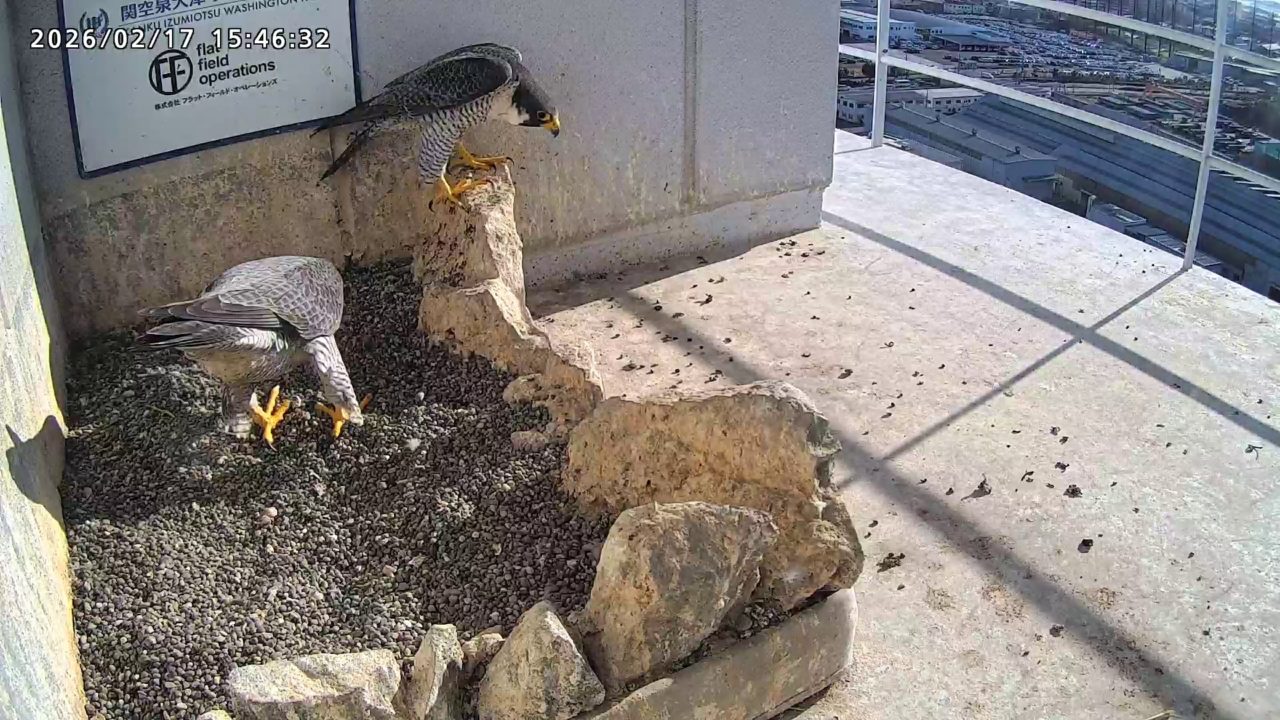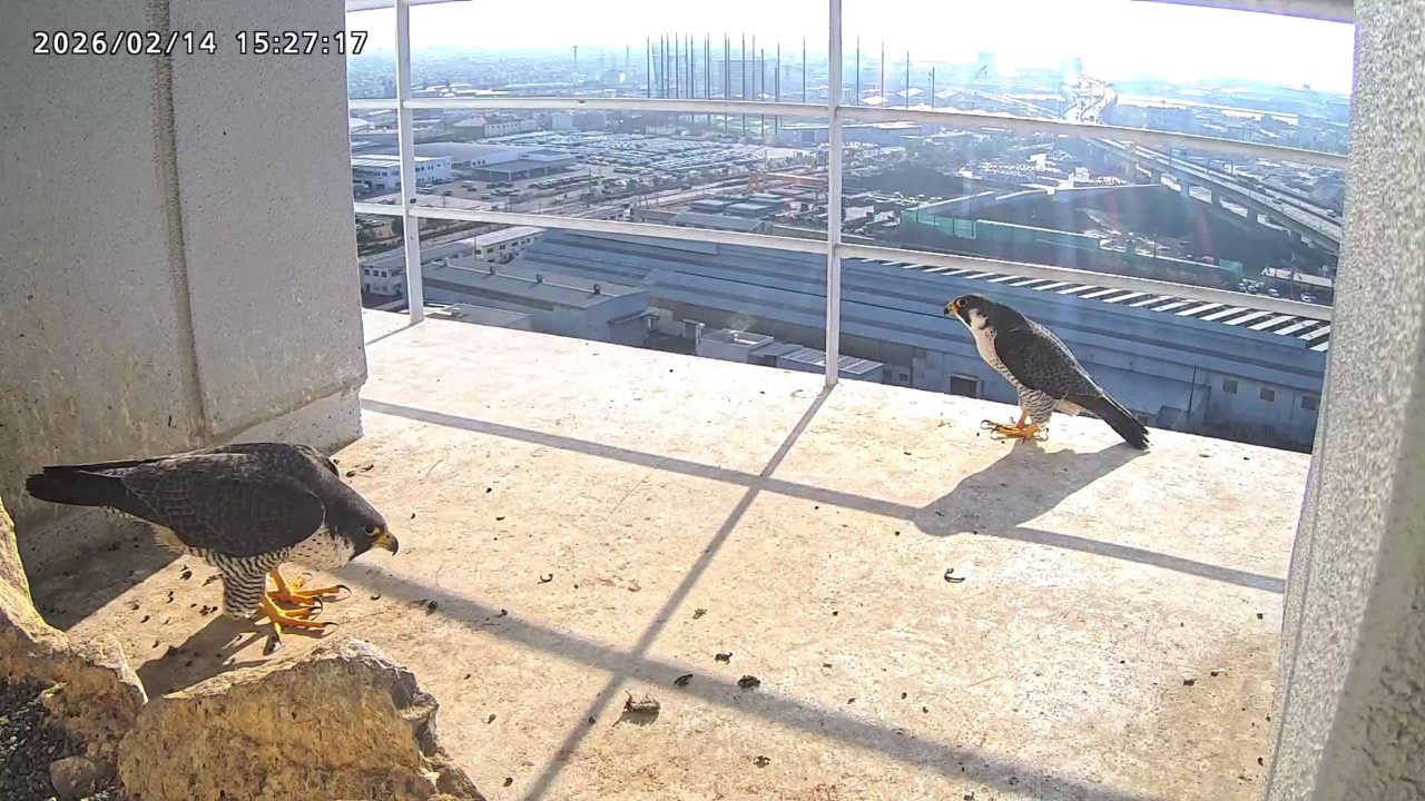 10:08 2羽で巣階にきてきららⅣくんが巣に入りました。さらちゃんは暫くベランダでぐずぐずしていましたが、きららⅣくんが巣から岩に乗るとそばに寄って来て、岩の上下でくちばし合わせをして挨拶しました。きららⅣくんが巣から出て手すりに移動、さらちゃんが巣に入りました。10:21さらちゃんが、10:24にきららⅣくんが飛びました。(動画あり) (動画あり:Full Ver.)