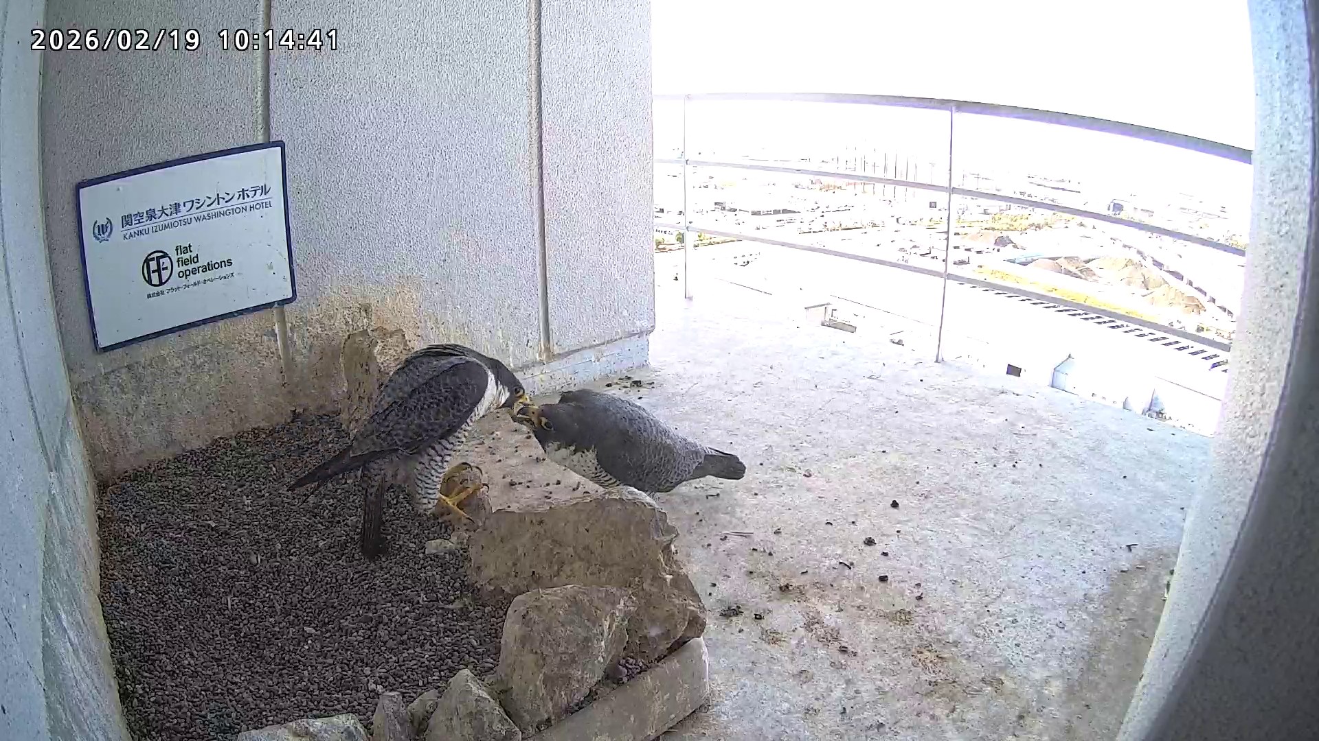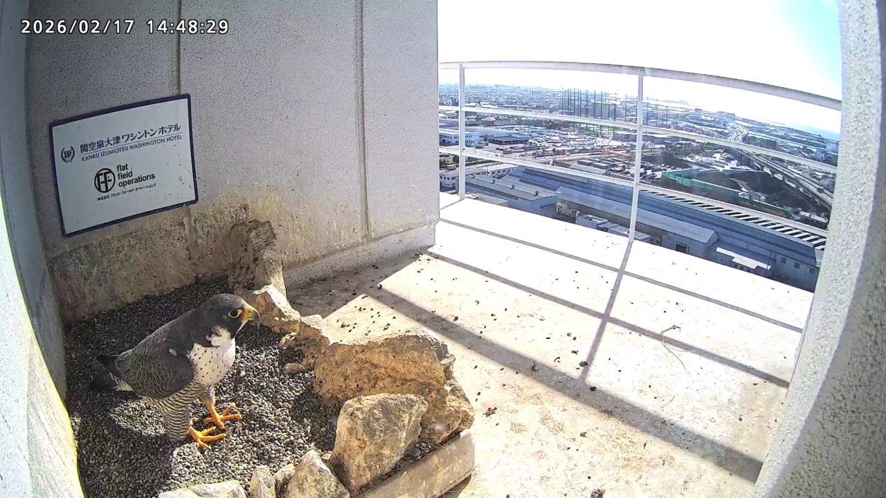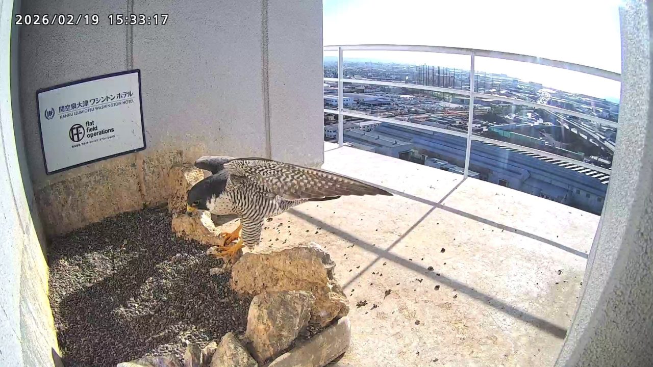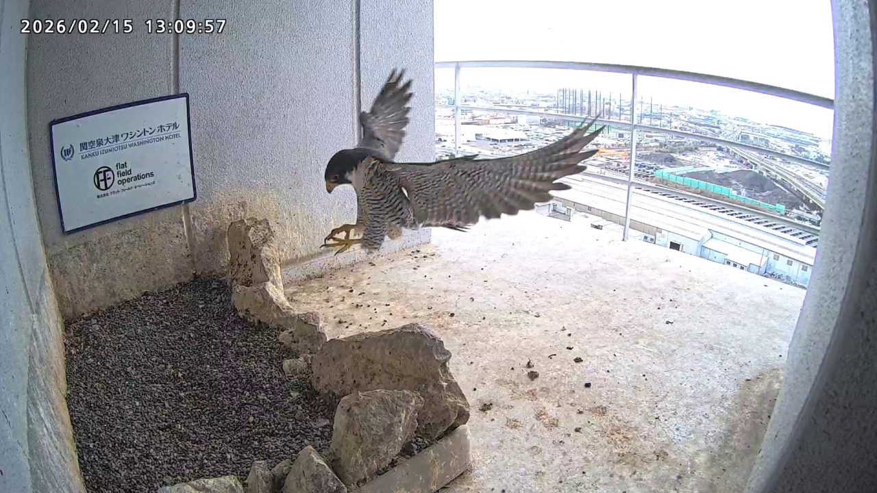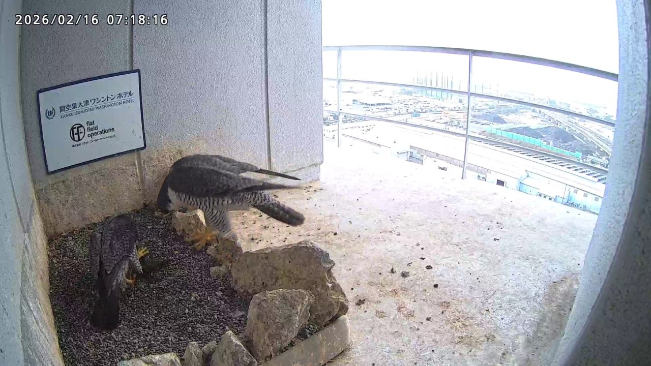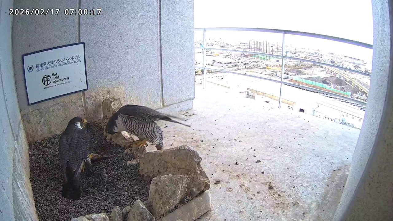 10:08 2羽で巣階にきてきららⅣくんが巣に入りました。さらちゃんは暫くベランダでぐずぐずしていましたが、きららⅣくんが巣から岩に乗るとそばに寄って来て、岩の上下でくちばし合わせをして挨拶しました。きららⅣくんが巣から出て手すりに移動、さらちゃんが巣に入りました。10:21さらちゃんが、10:24にきららⅣくんが飛びました。(動画あり) (動画あり:Full Ver.)