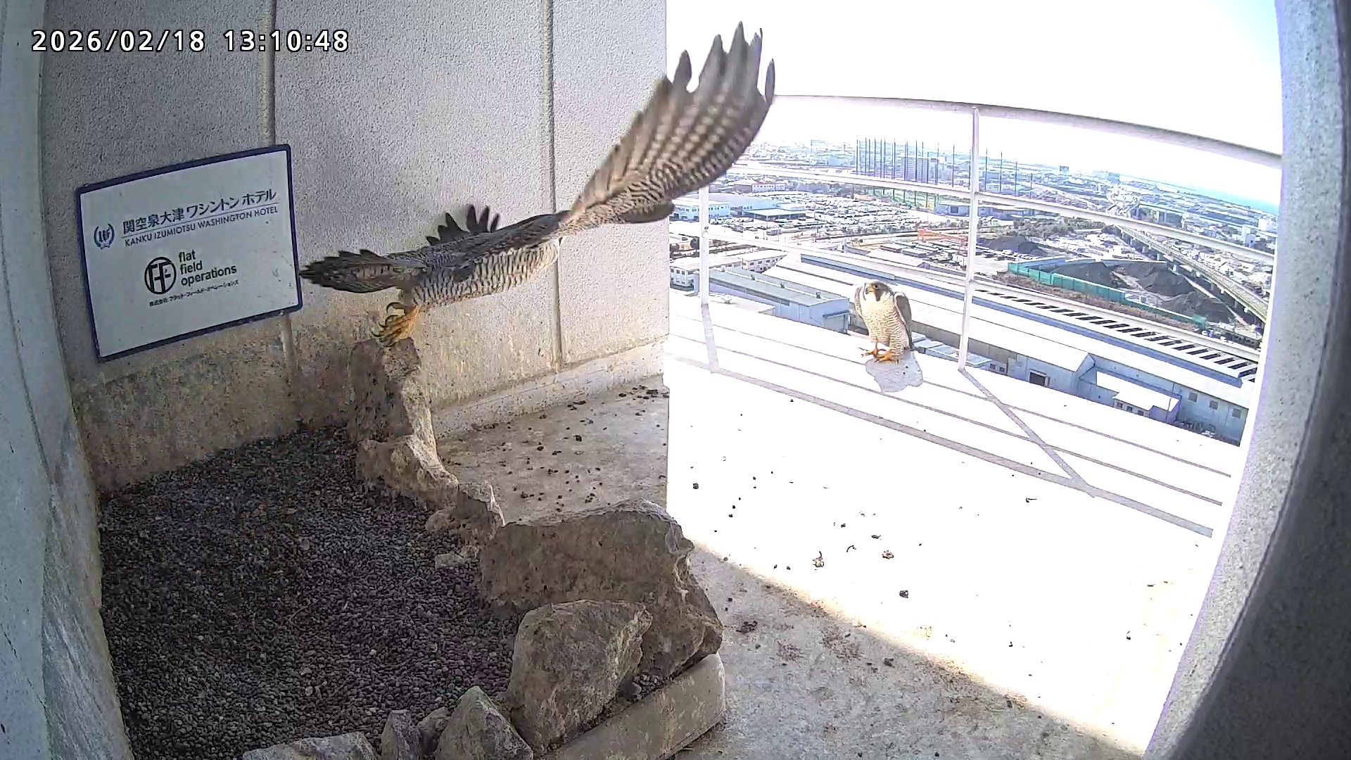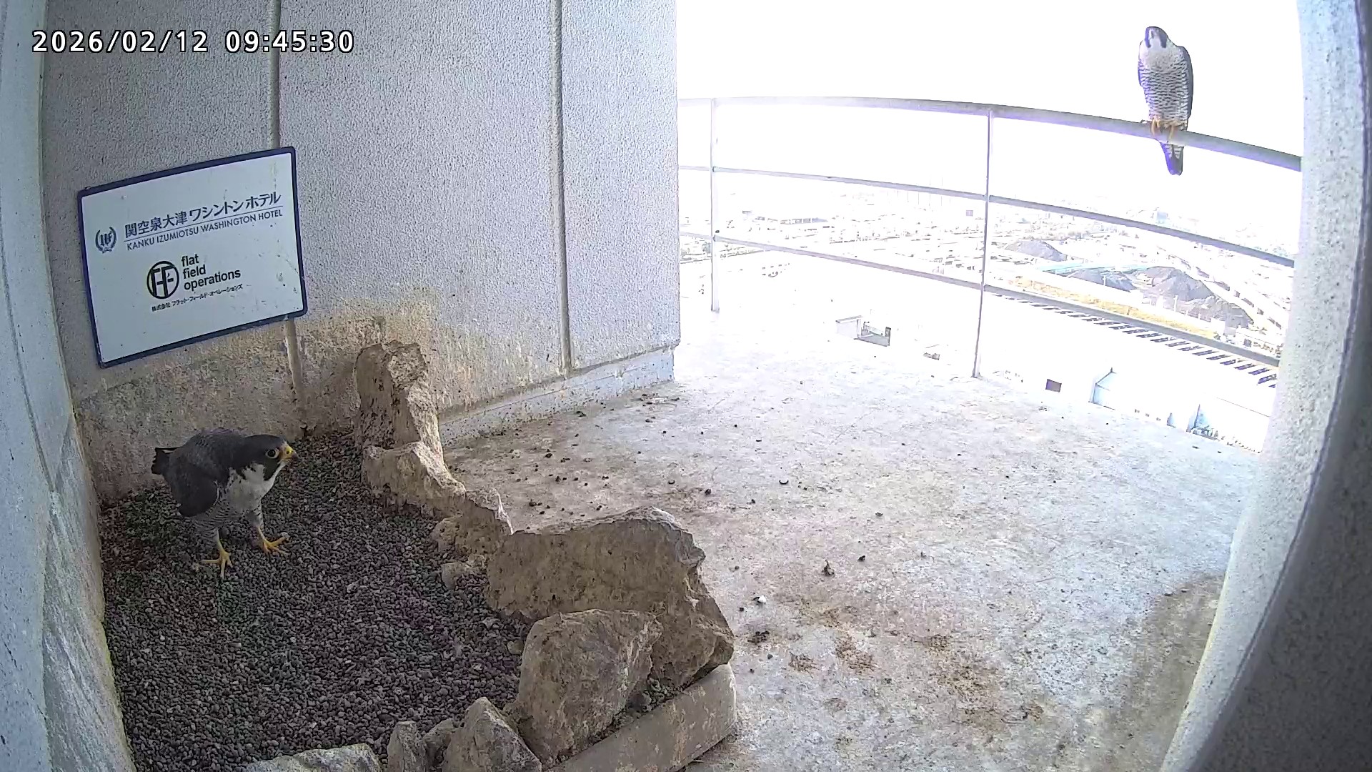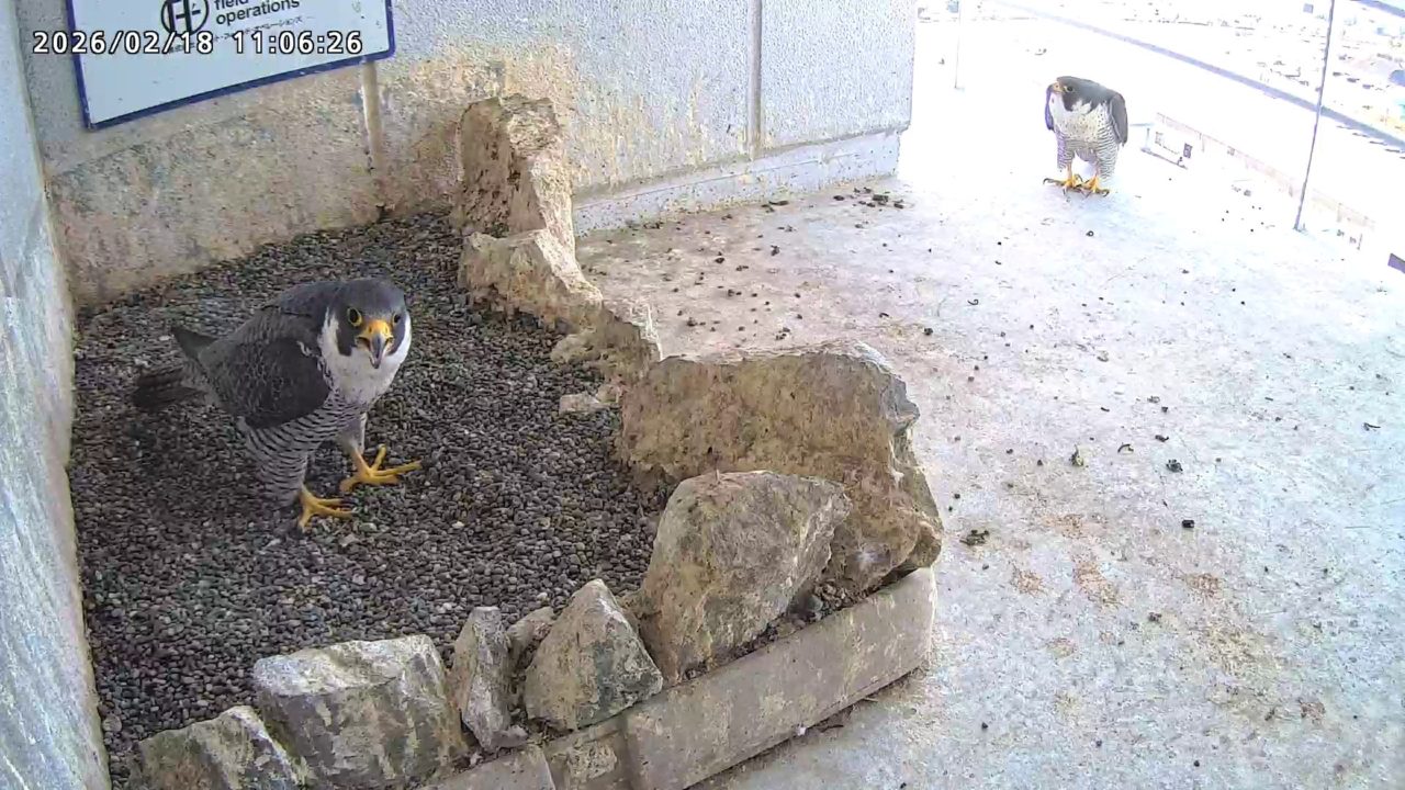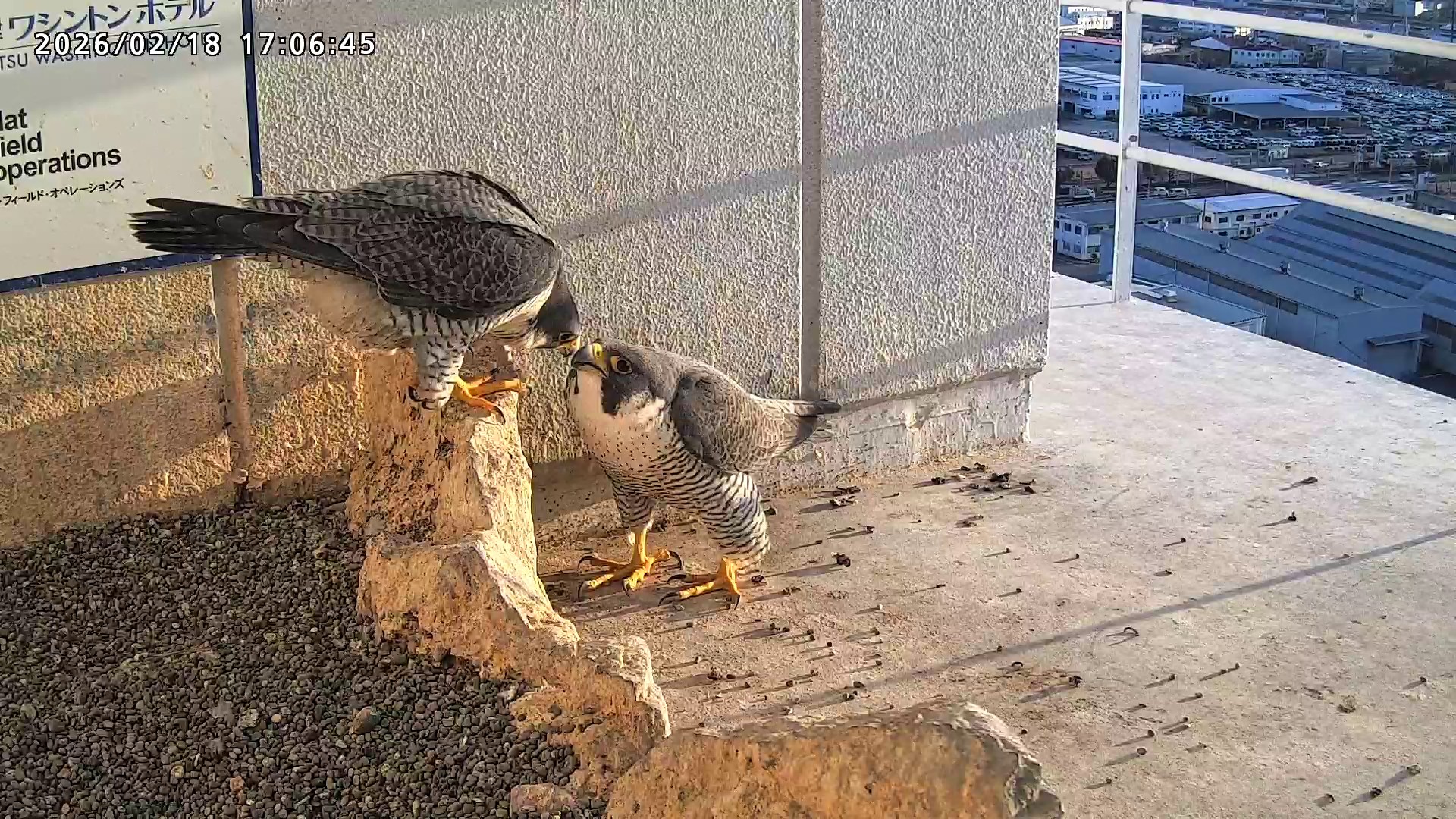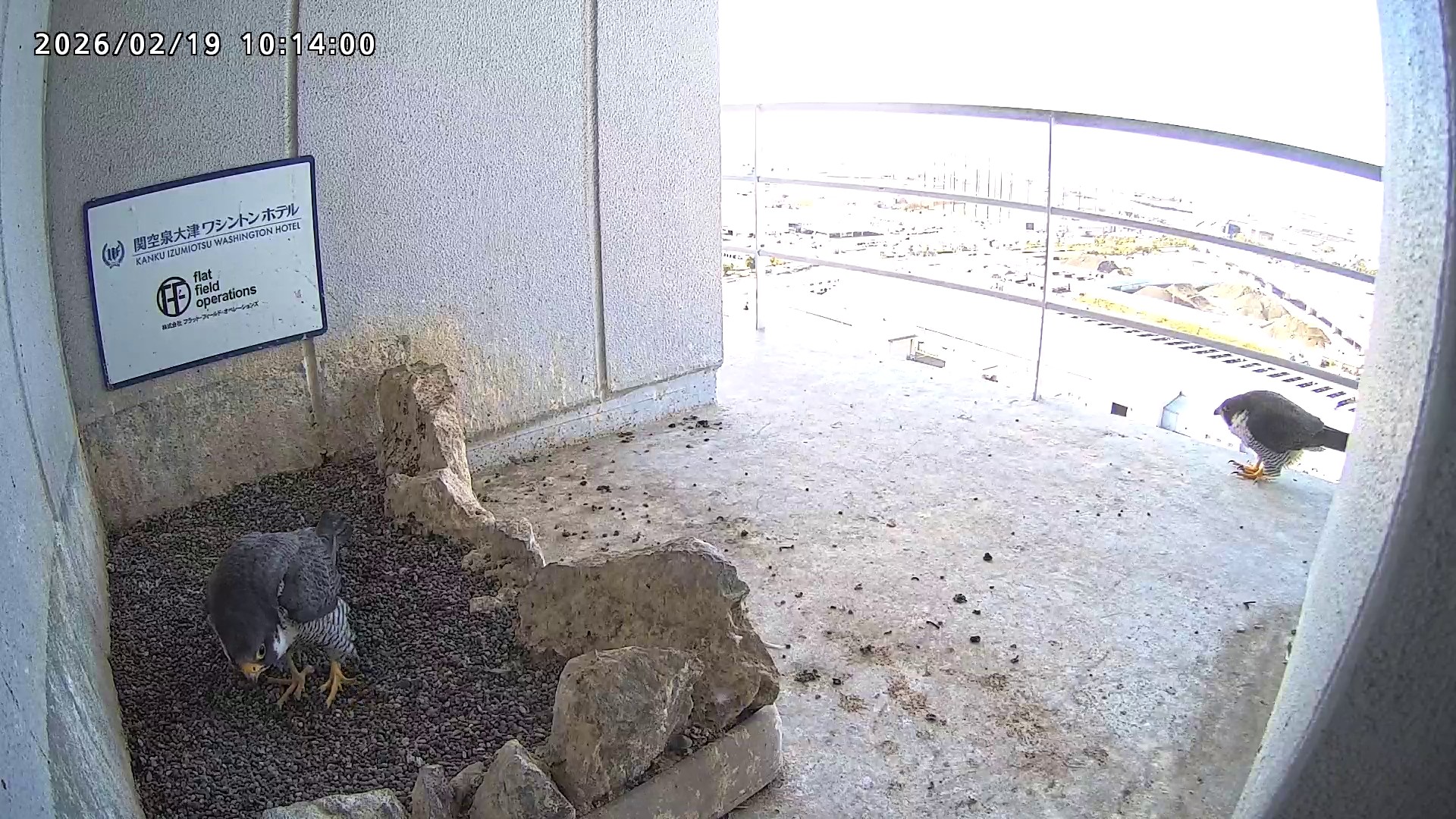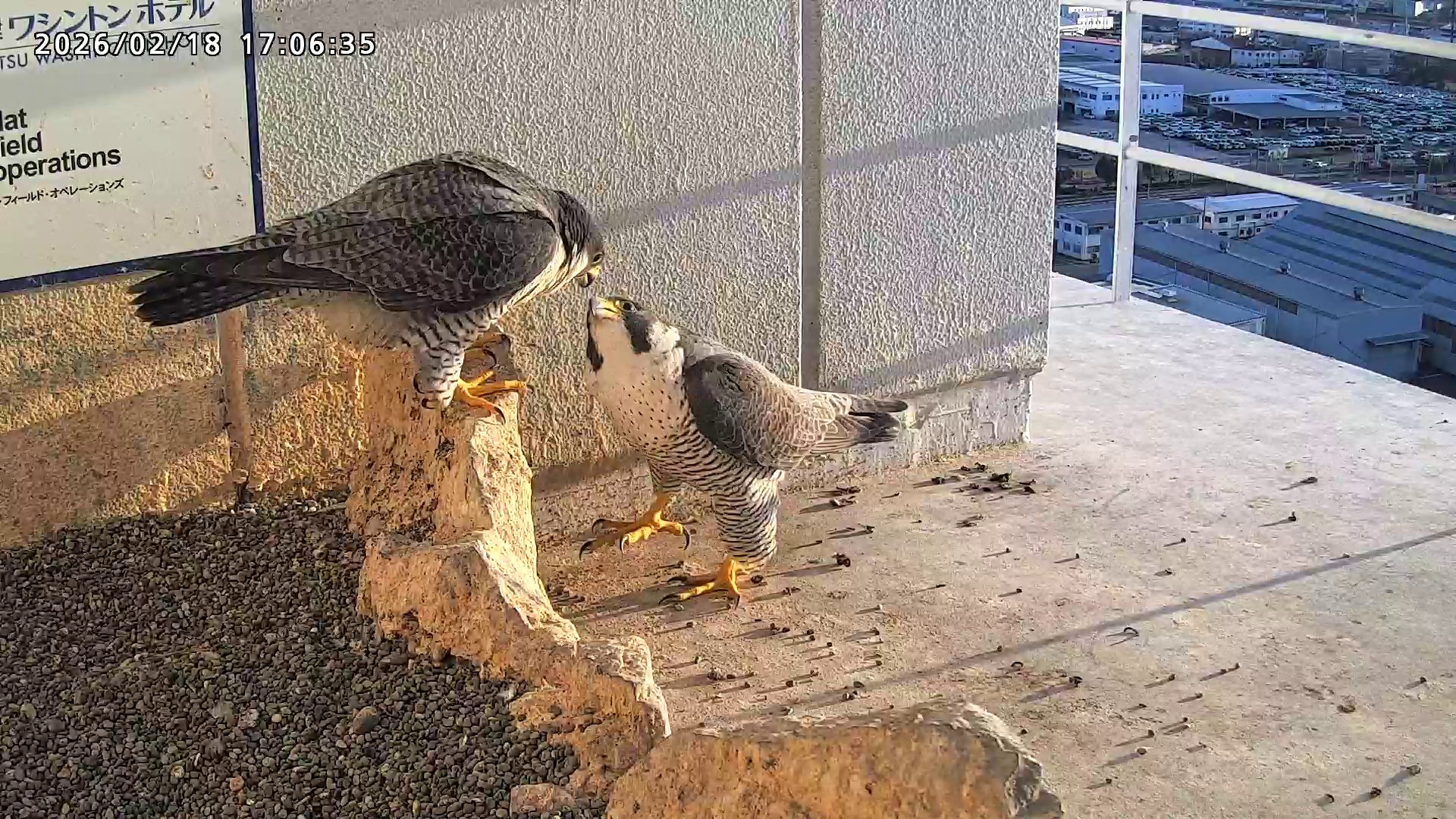 10:08 2羽で巣階にきてきららⅣくんが巣に入りました。さらちゃんは暫くベランダでぐずぐずしていましたが、きららⅣくんが巣から岩に乗るとそばに寄って来て、岩の上下でくちばし合わせをして挨拶しました。きららⅣくんが巣から出て手すりに移動、さらちゃんが巣に入りました。10:21さらちゃんが、10:24にきららⅣくんが飛びました。(動画あり) (動画あり:Full Ver.)