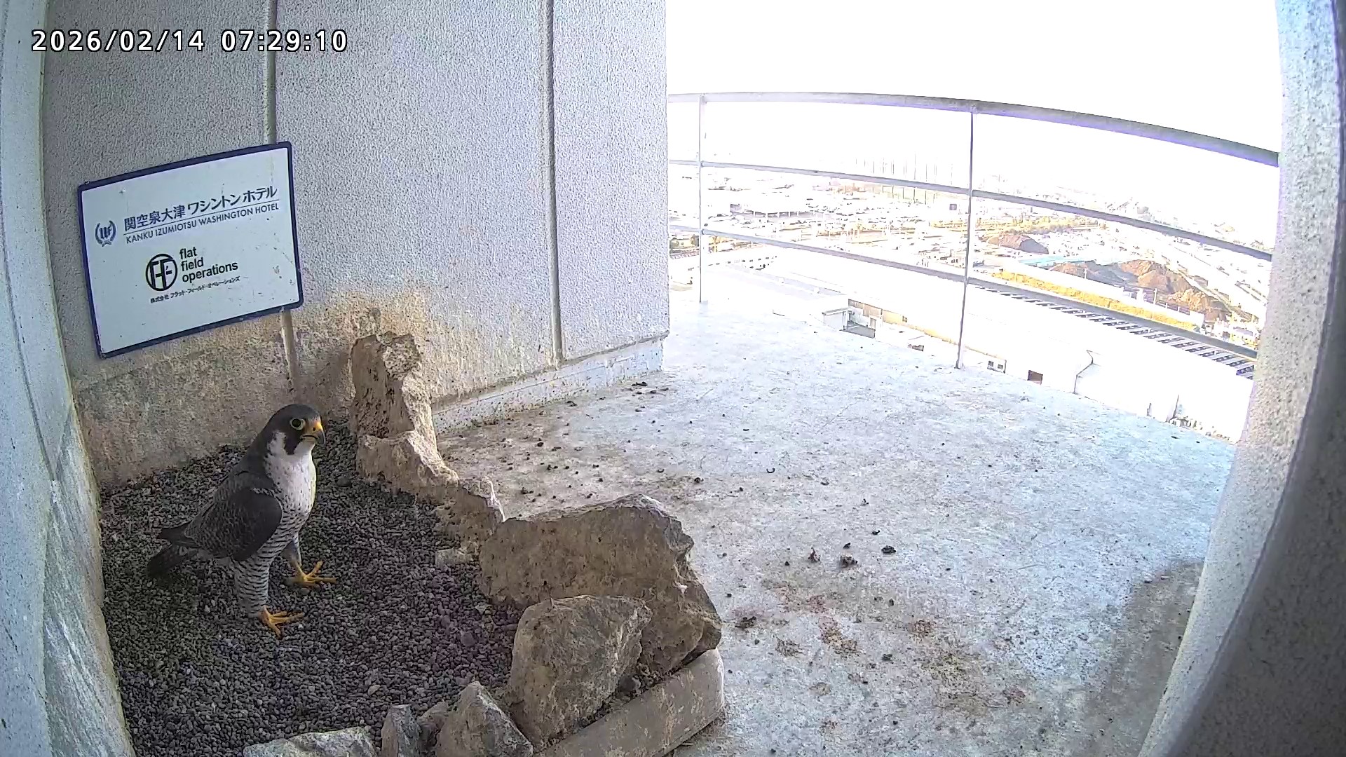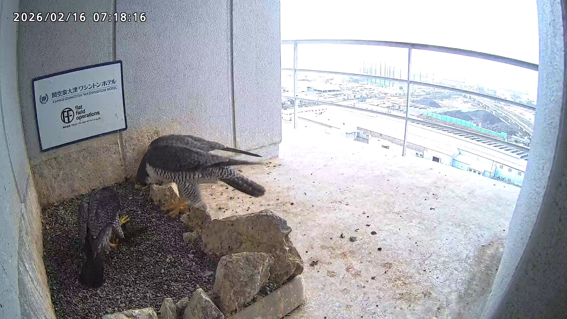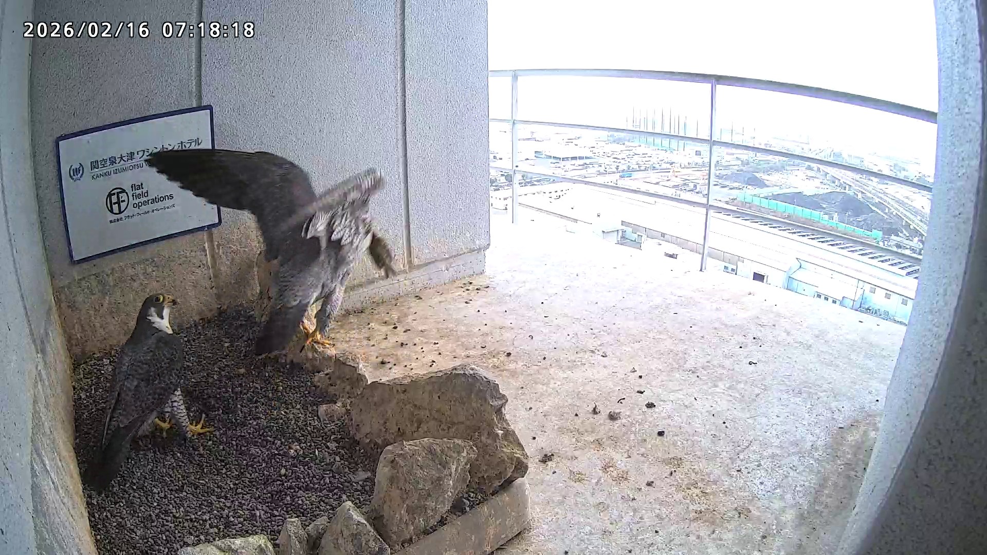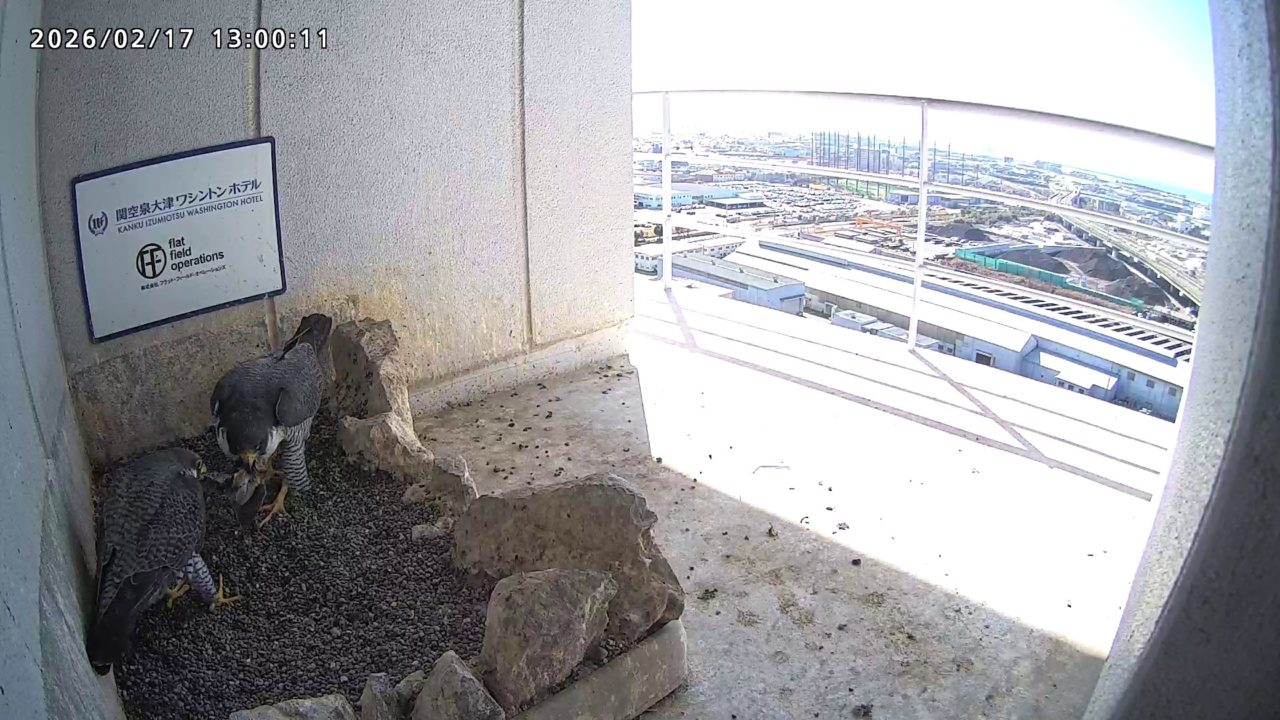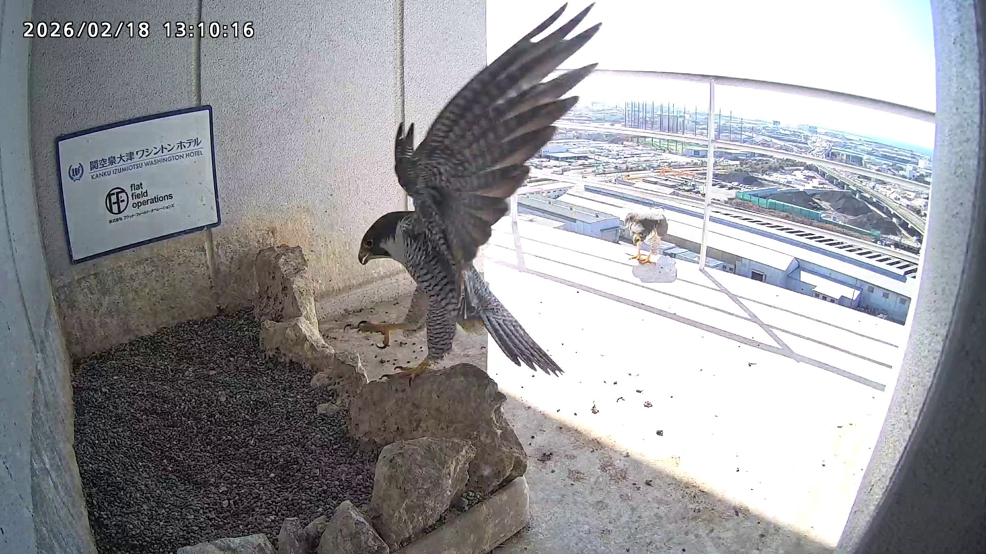 10:08 2羽で巣階にきてきららⅣくんが巣に入りました。さらちゃんは暫くベランダでぐずぐずしていましたが、きららⅣくんが巣から岩に乗るとそばに寄って来て、岩の上下でくちばし合わせをして挨拶しました。きららⅣくんが巣から出て手すりに移動、さらちゃんが巣に入りました。10:21さらちゃんが、10:24にきららⅣくんが飛びました。(動画あり) (動画あり:Full Ver.)