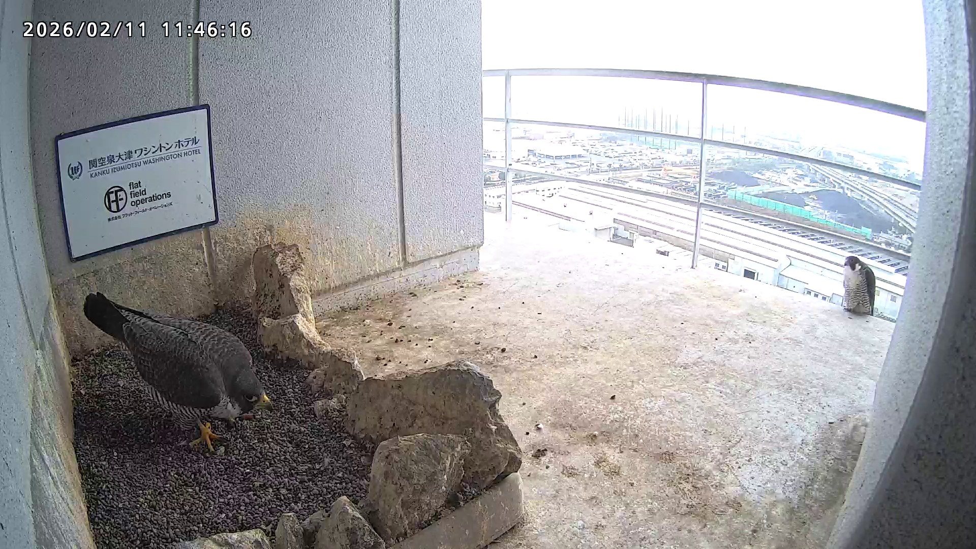 11:31、きららⅣくんが手すりに移動しさらちゃんがちょっとだけ巣から出た隙に、きららⅣくんが巣に飛び込み、それを見たさらちゃんも巣に入り、2回目の巣の中ツーショット。11:42、2羽とも飛びました。