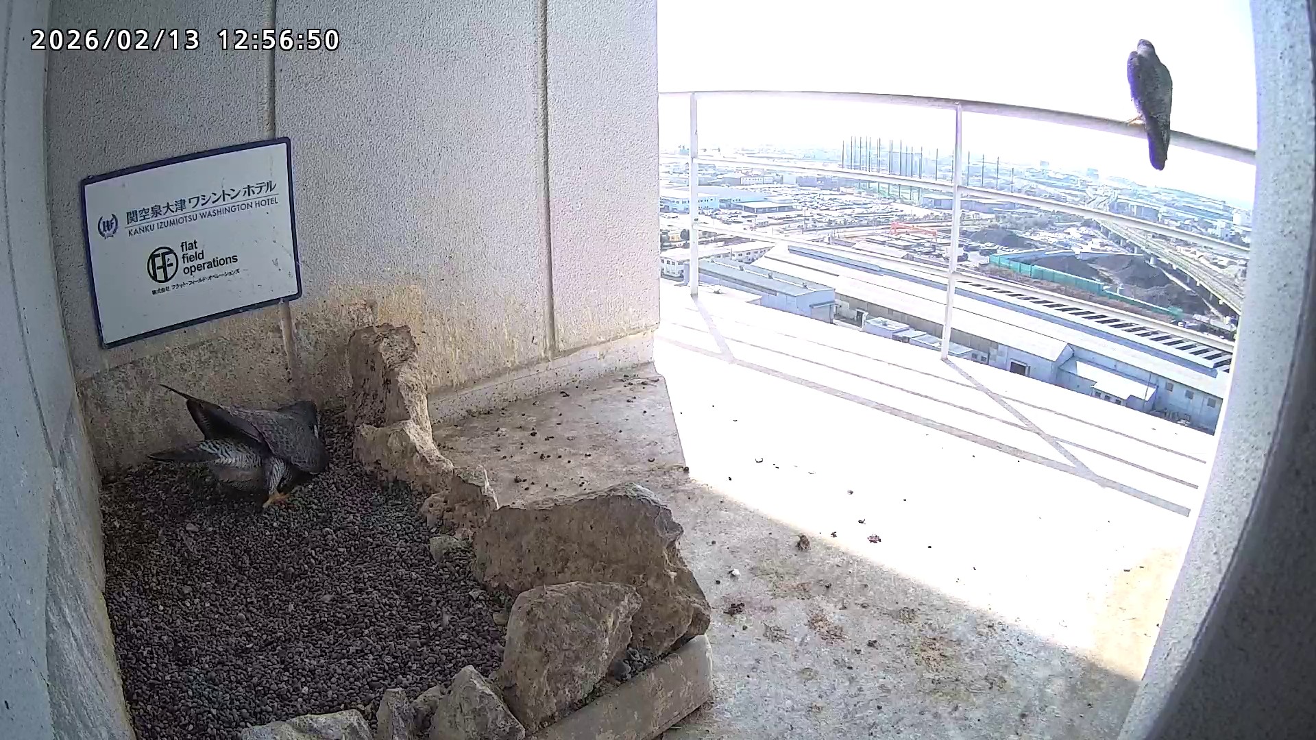 12:30 ベランダのさらちゃんを飛び越してきららⅣくんが巣に飛び込みました。しばらくしてカメラ下を通って、さらちゃんも巣に入り巣の中ツーショット。12:44にさらちゃんが飛び、きららⅣくんは12:47に飛びました。