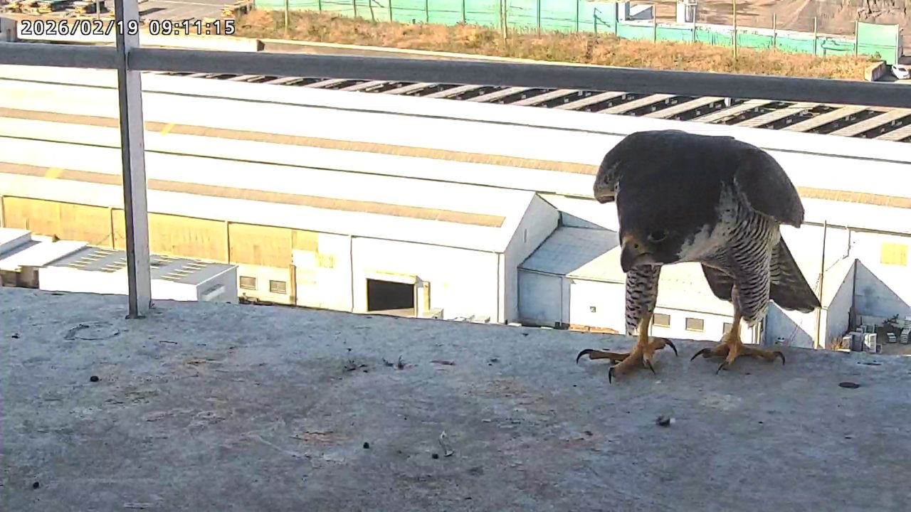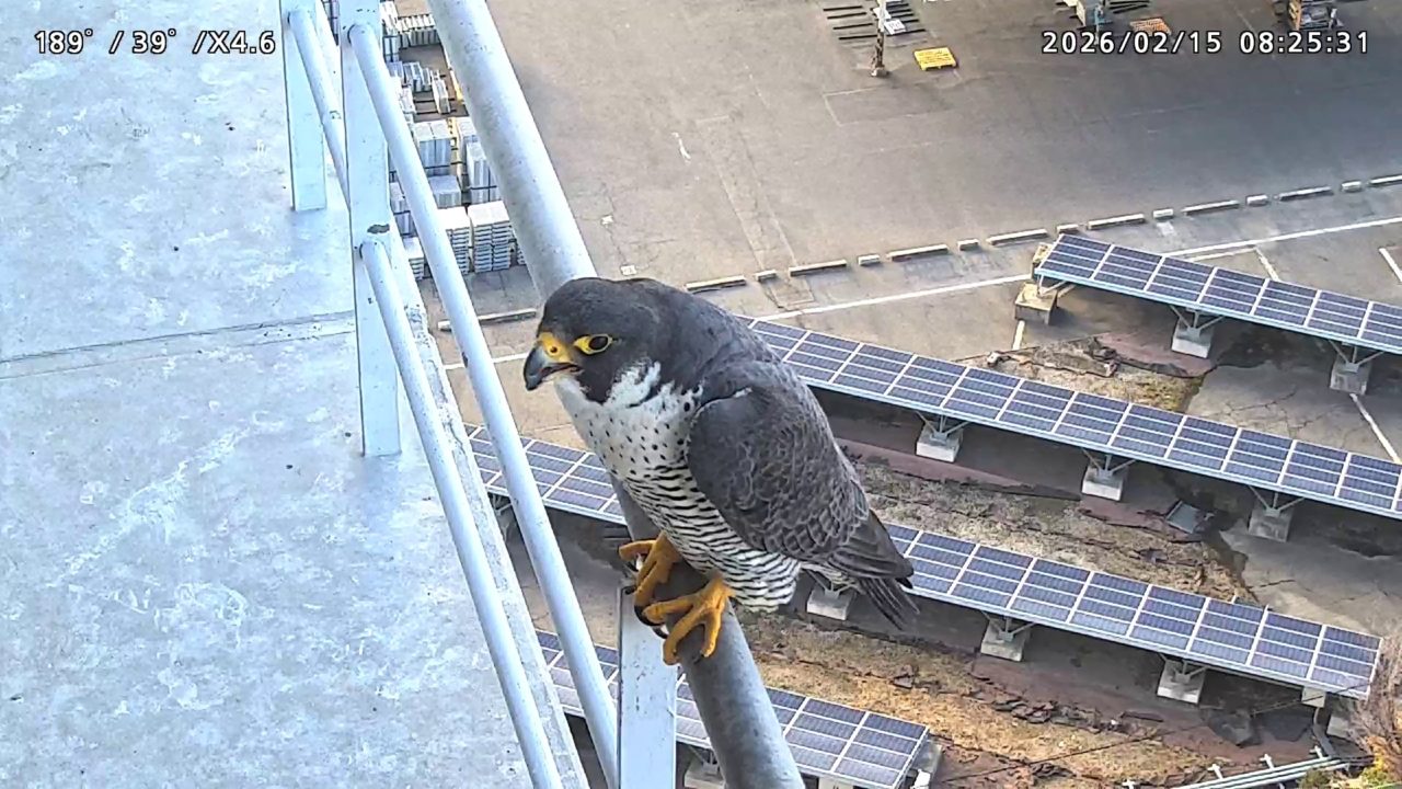 10:39 さらちゃんが巣階に来ました。きららⅣくんは目の前を飛びましたが巣階には留まりませんでした。さらちゃんは手すりで長居しましたが、11:18に飛びました(動画あり)