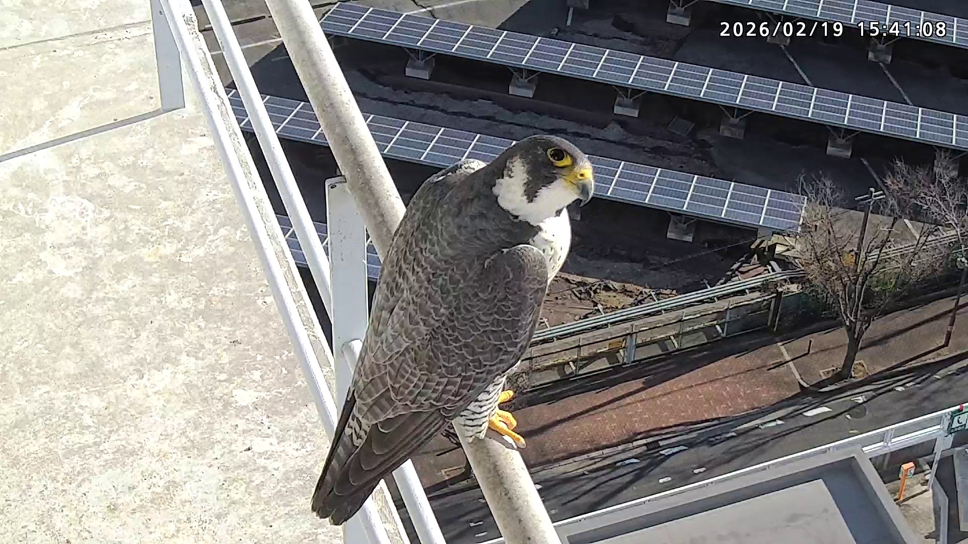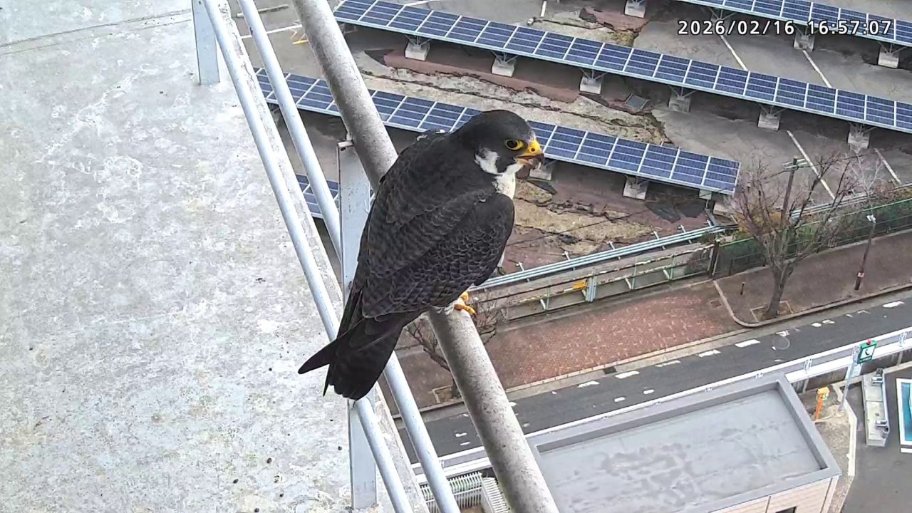 16:03 2羽揃って巣階に来ました。きららⅣくんが巣に入りましたが、さらちゃんはすぐに飛びました。きららⅣくんは手すりに移動し、17:13に飛びました。
