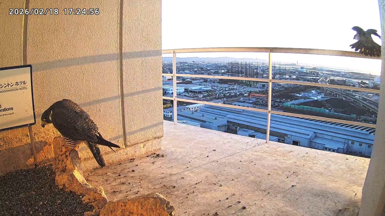 18:04 2羽巣階に来ましたが、何かに驚いてすぐに飛びました。