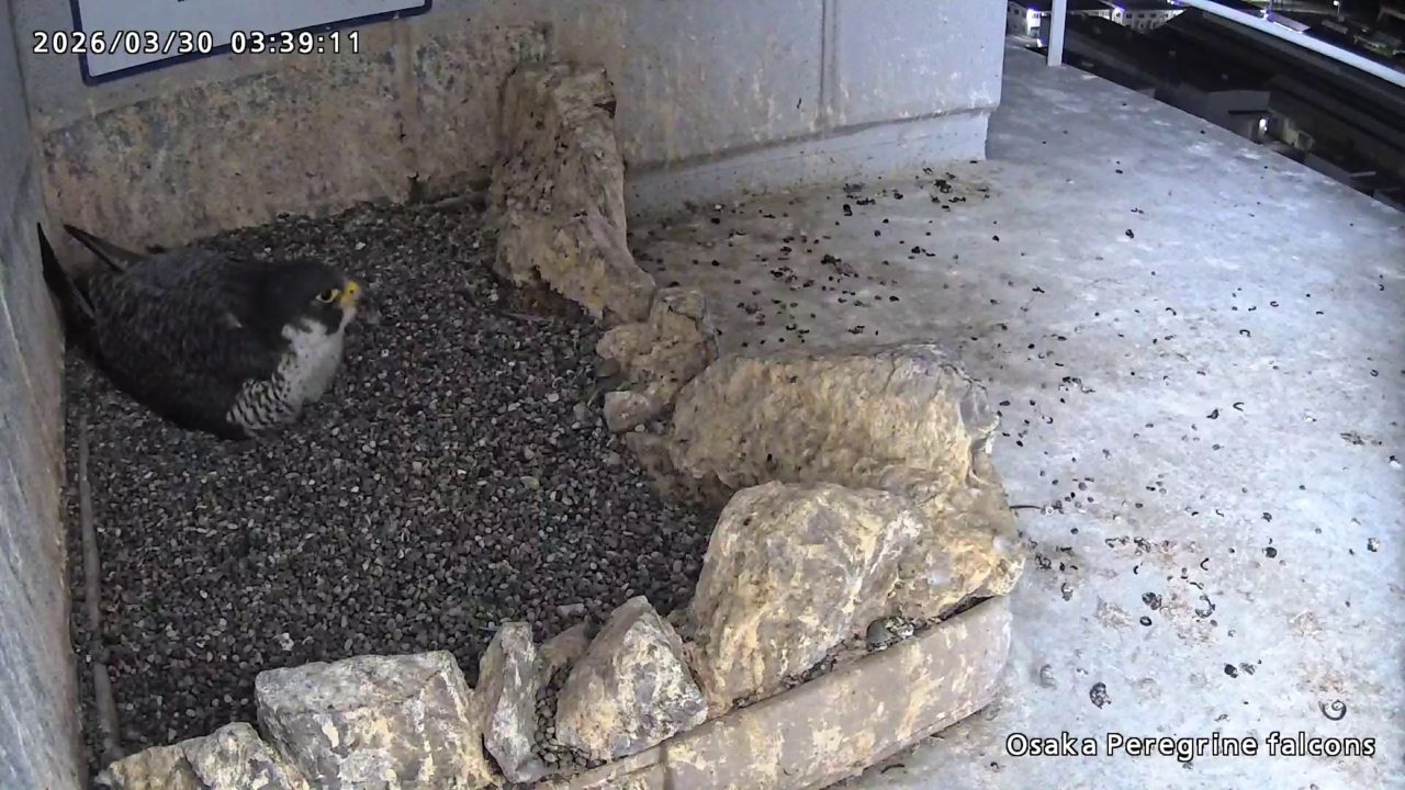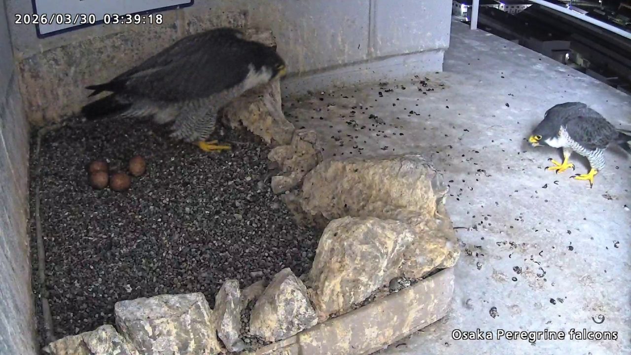03:39 前日から抱卵していたさらちゃんのところに、きららⅣくんが手すりから巣に入り抱卵交代。