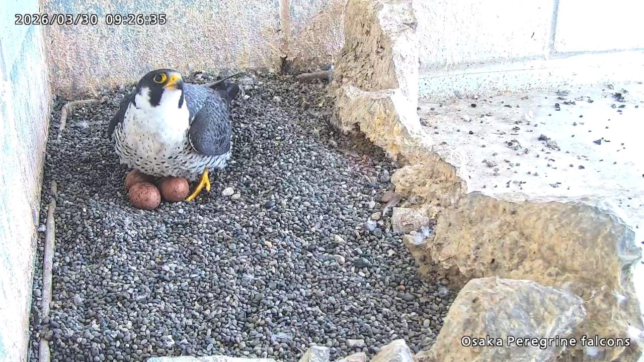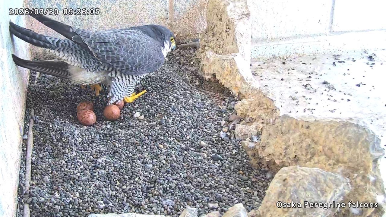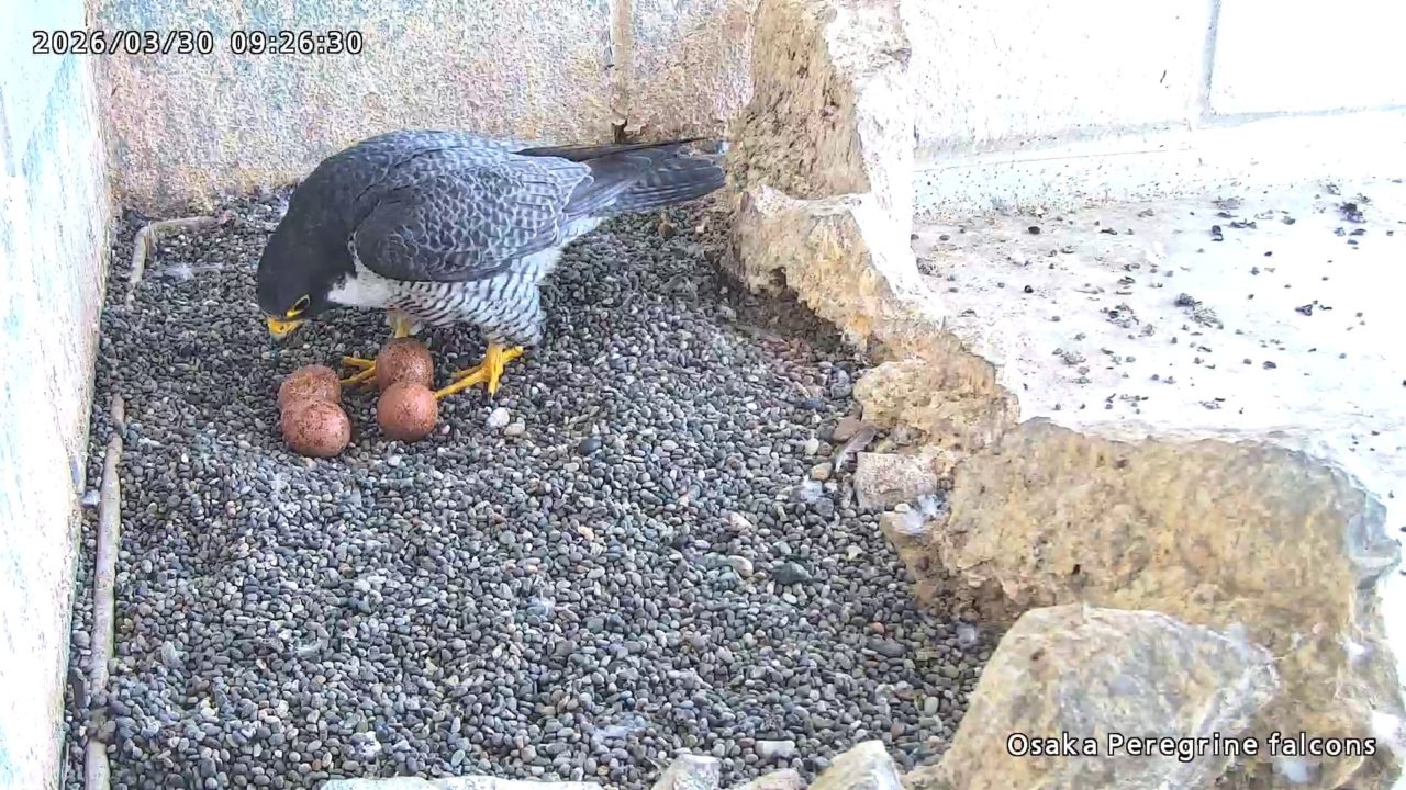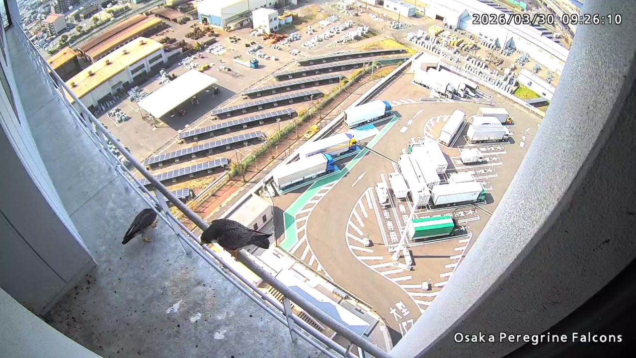 09:53 きららⅣくんが手すりに移動し飛びました。09:57にさらちゃんがベランダから巣に入り抱卵交代。