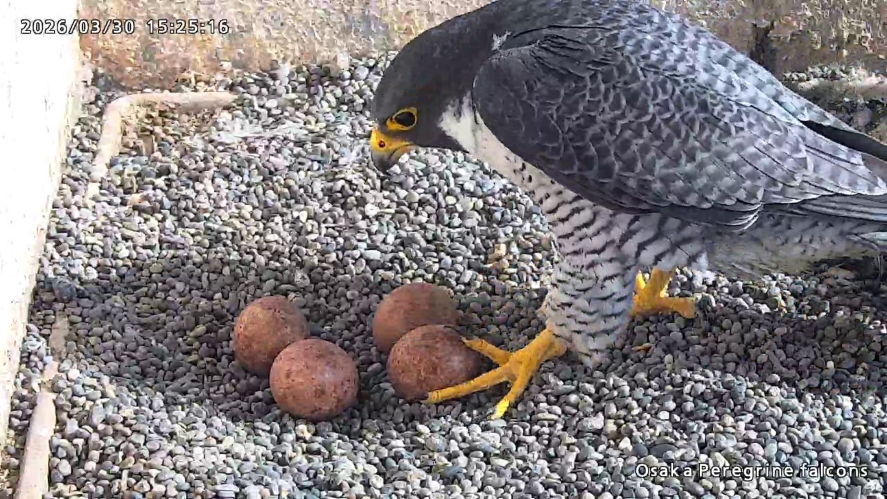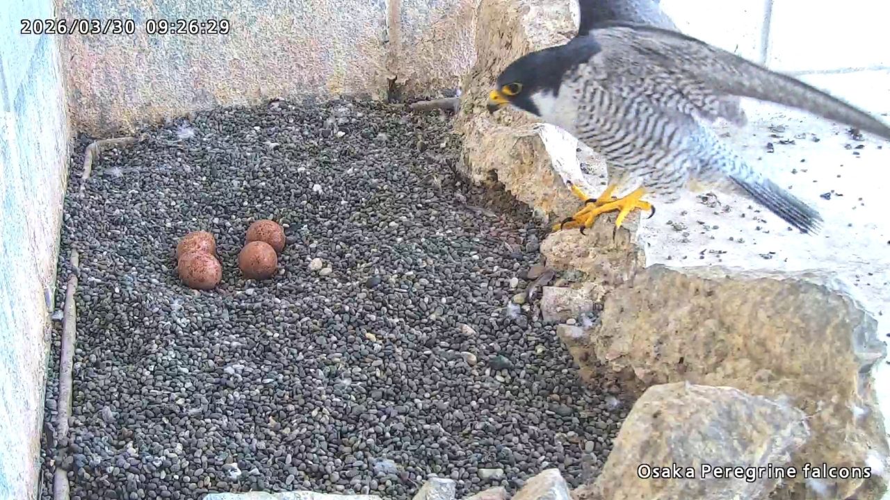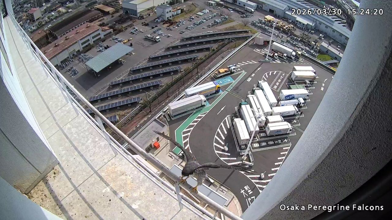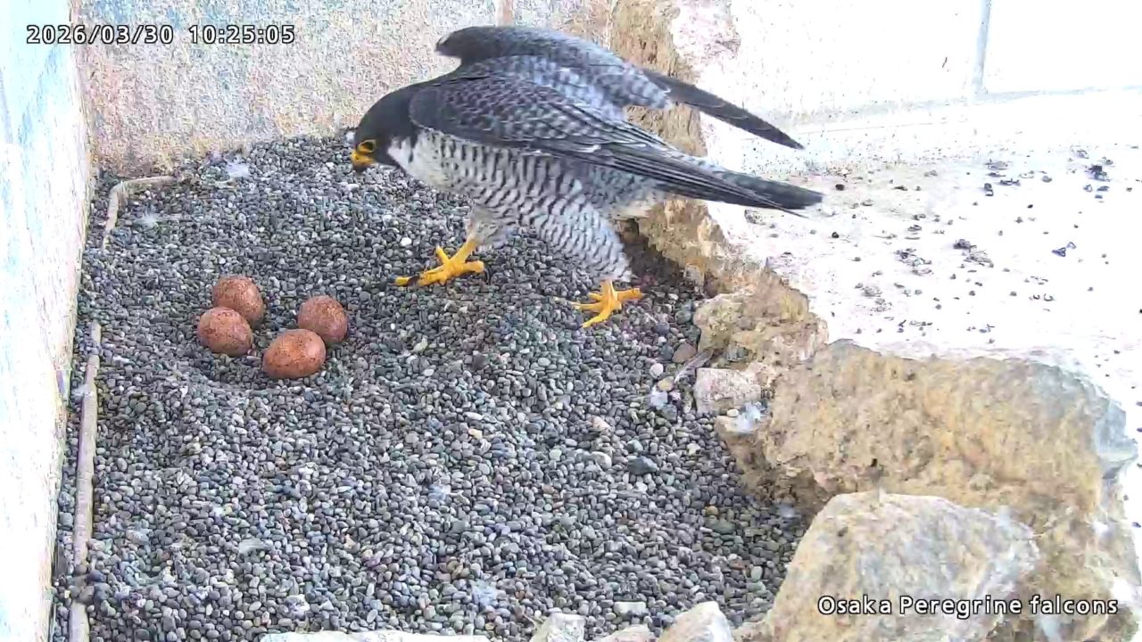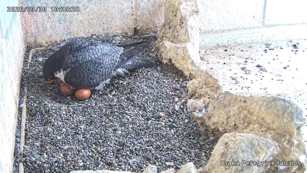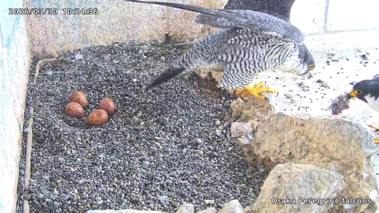 10:24 さらちゃんが抱卵中に、きららⅣくんがごはん持ちで手すりに来ました。さらちゃんはベランダで受け取り飛び、きららⅣくんが巣に入り抱卵交代。(動画あり)