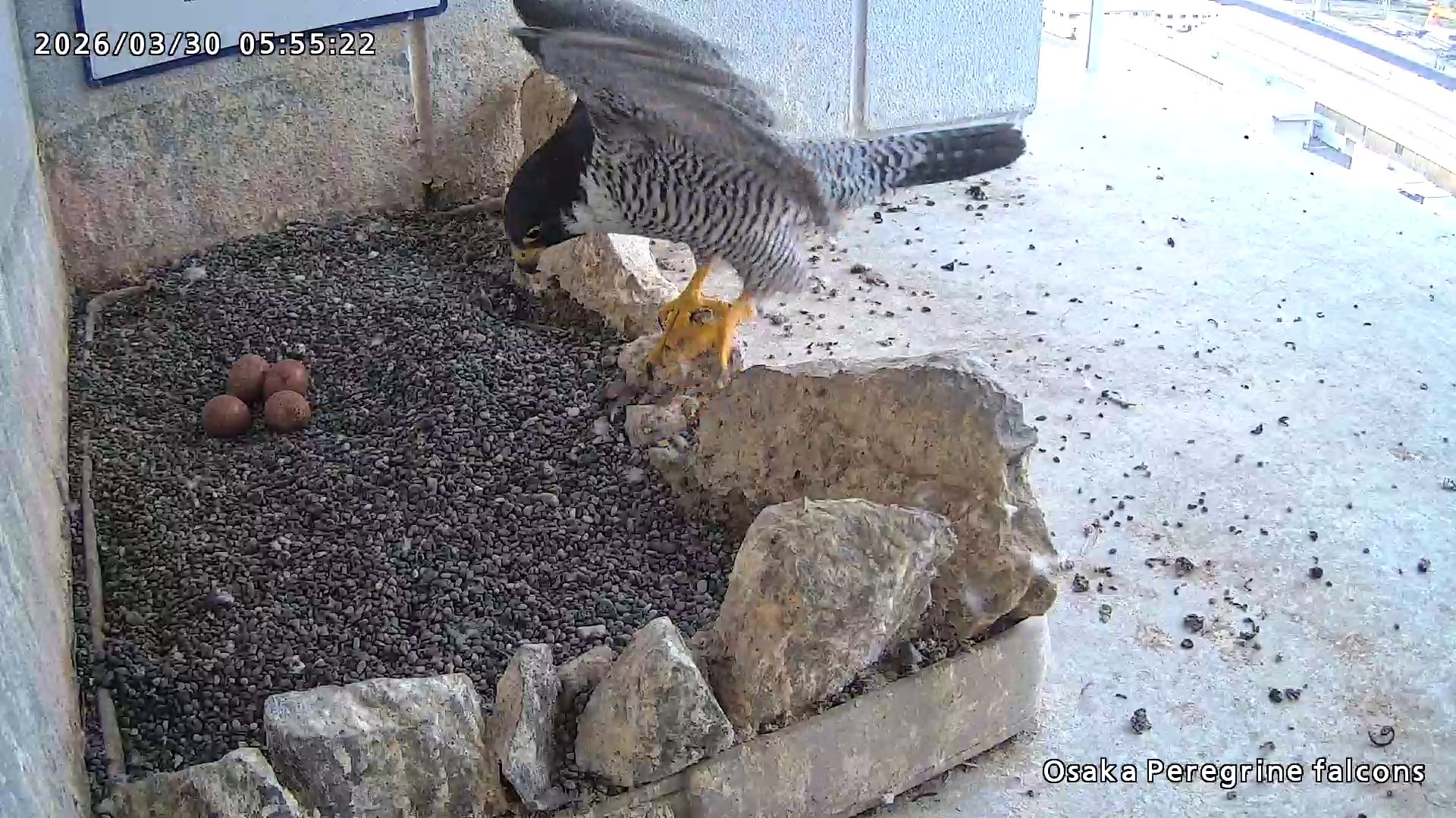 05:51 きららⅣくんが手すりに移動し飛びました。05:55にさらちゃんが来て抱卵交代。