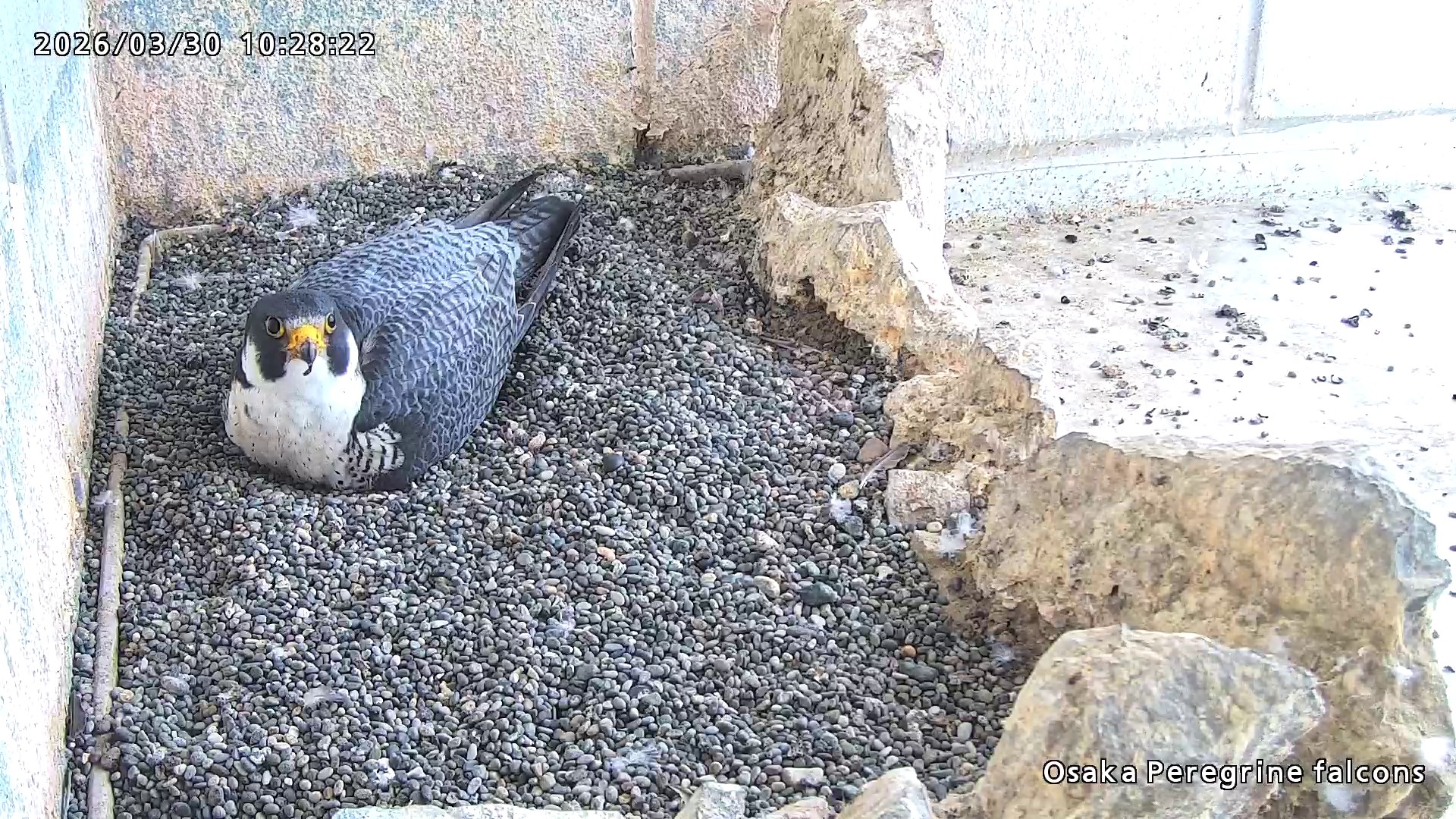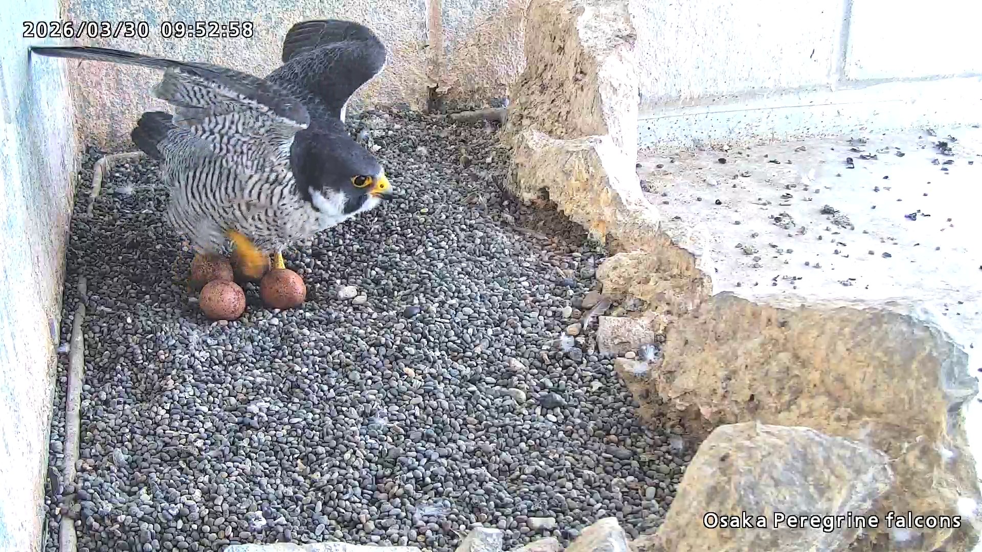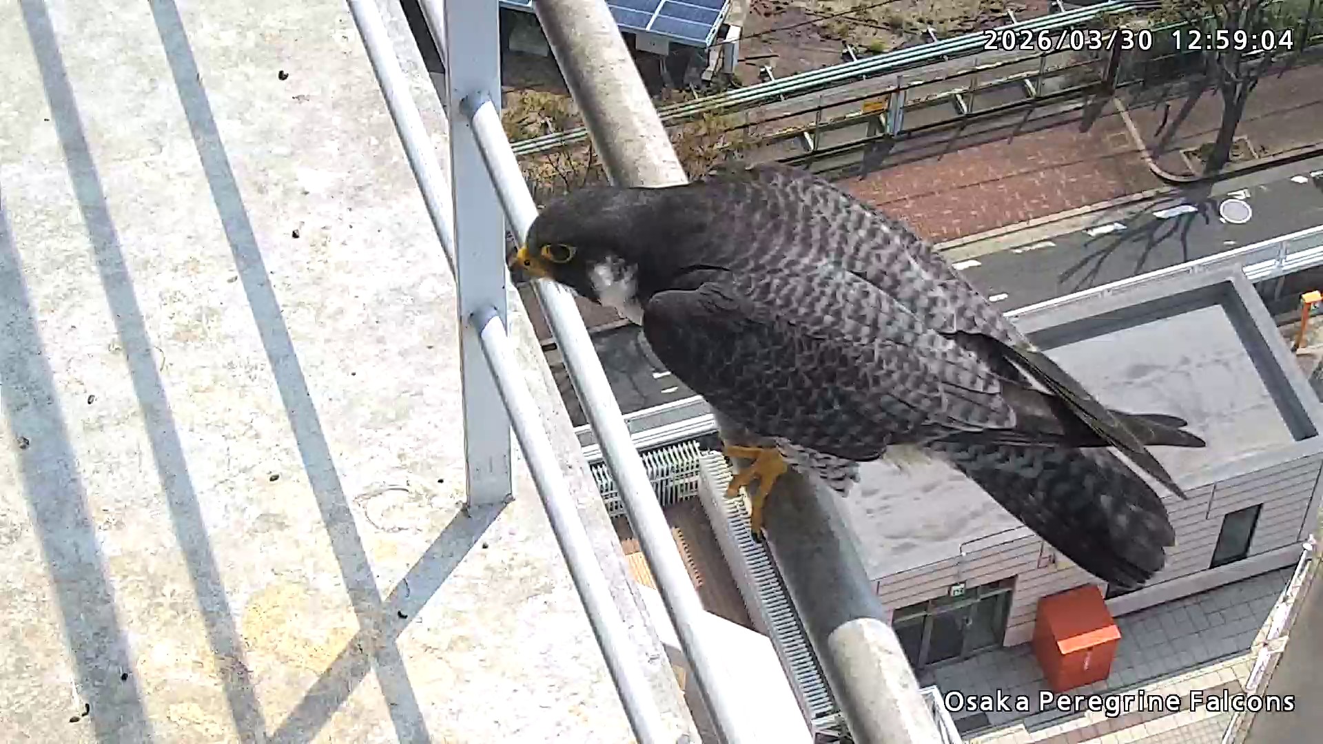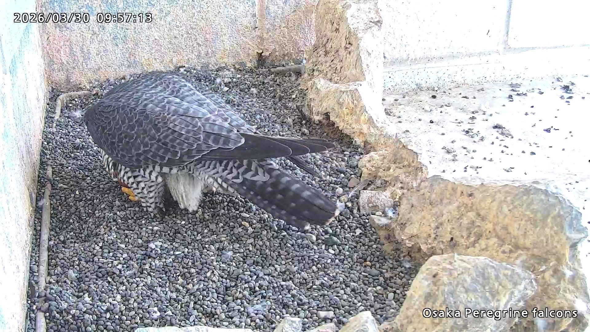 09:53 きららⅣくんが手すりに移動し飛びました。09:57にさらちゃんがベランダから巣に入り抱卵交代。