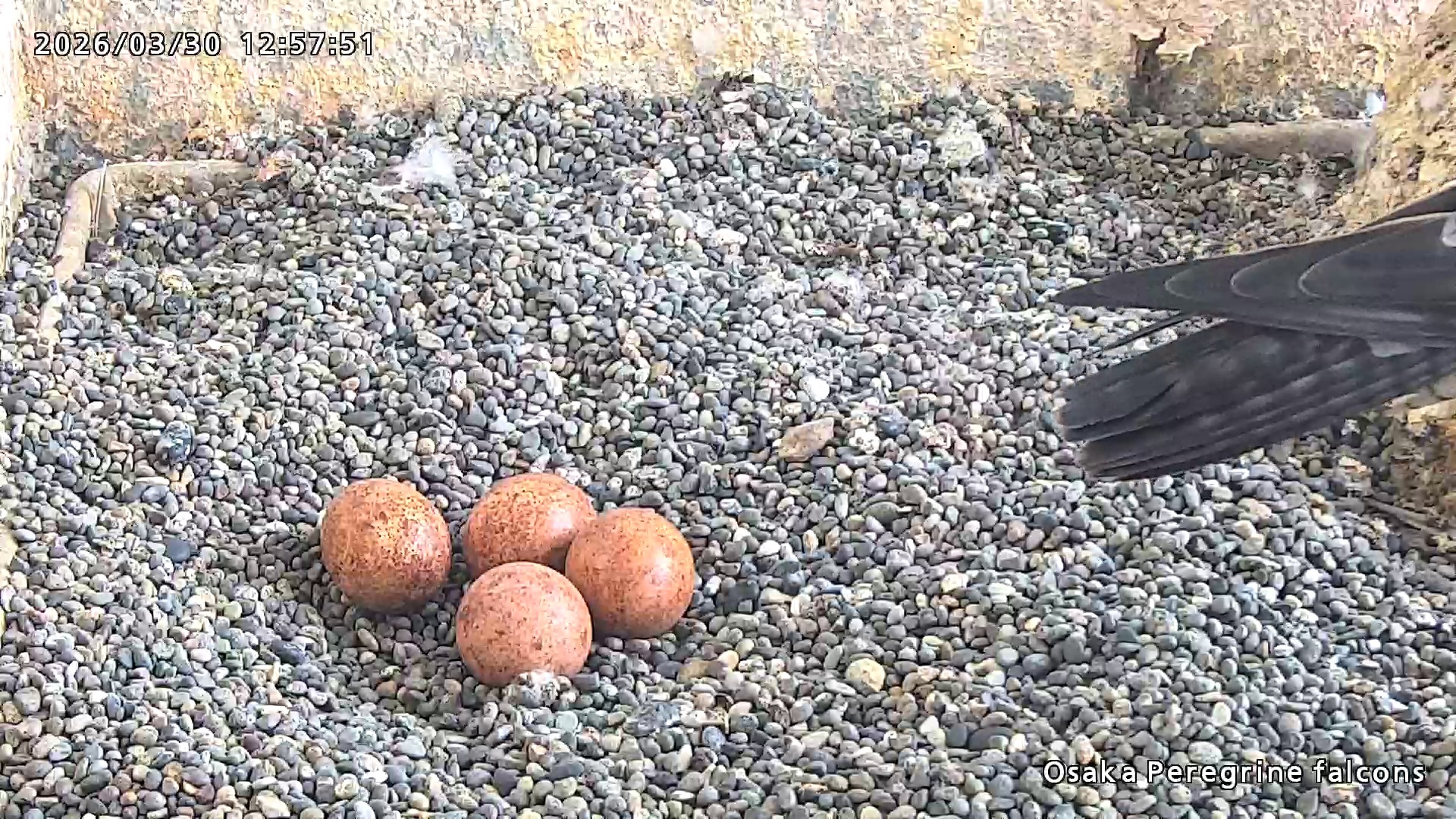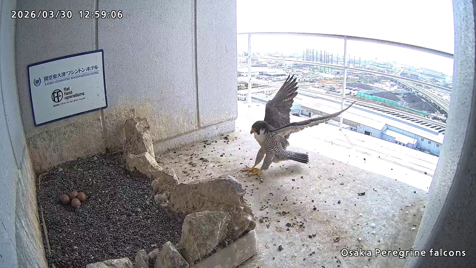 10:24 さらちゃんが抱卵中に、きららⅣくんがごはん持ちで手すりに来ました。さらちゃんはベランダで受け取り飛び、きららⅣくんが巣に入り抱卵交代。(動画あり)